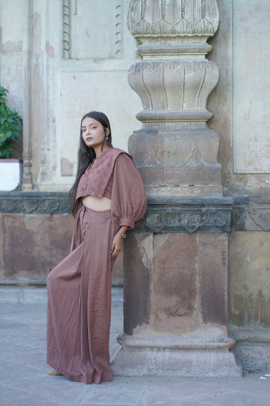 Brown Pleated Pants with Crop Button Up Top
