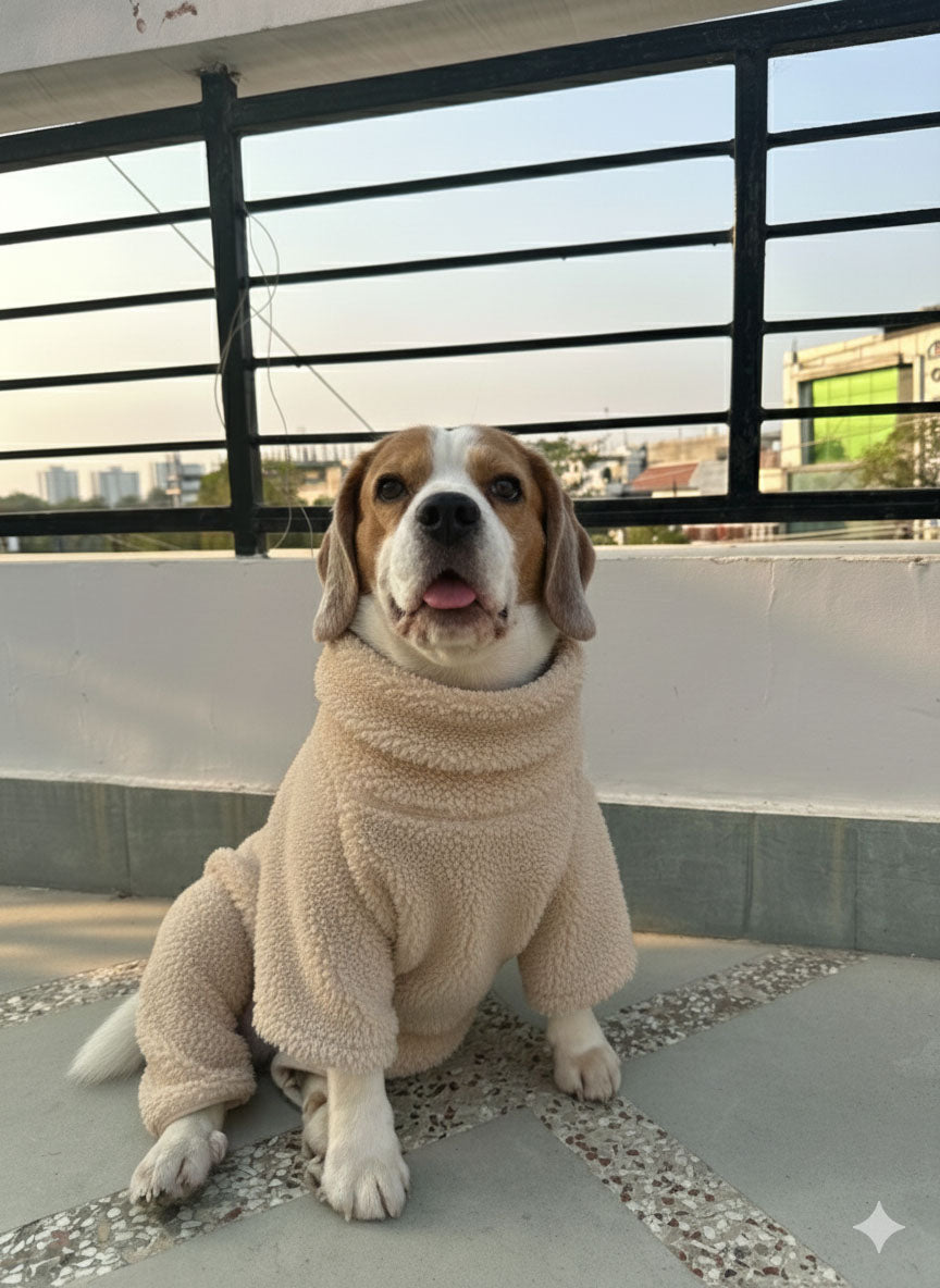 Keep your dog cozy and stylish with our Beige High neck Romper! Featuring skeeve pattern with ranglan sleeve, it’s made from warm, comfortable fabric for winter.