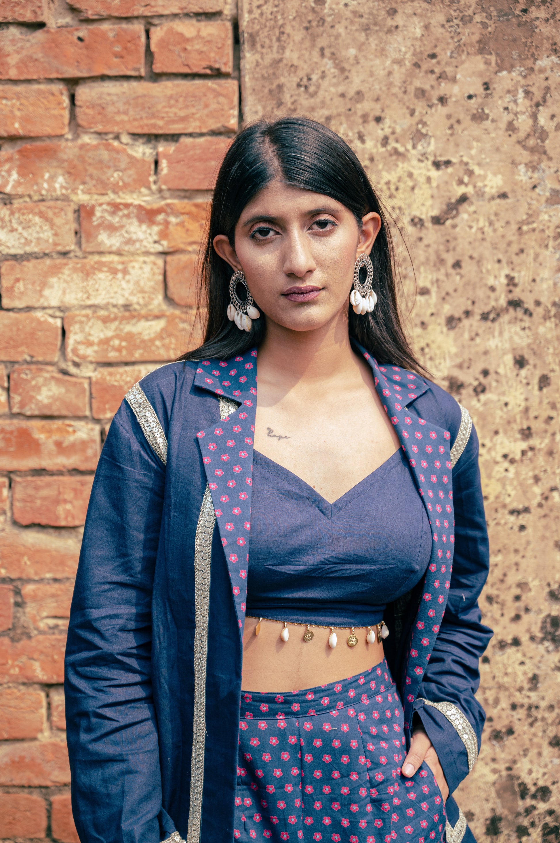The vibrant tailored trio set comprising of laces details, blazer paired with tailored pants and elastic detailed bustier with shell details.