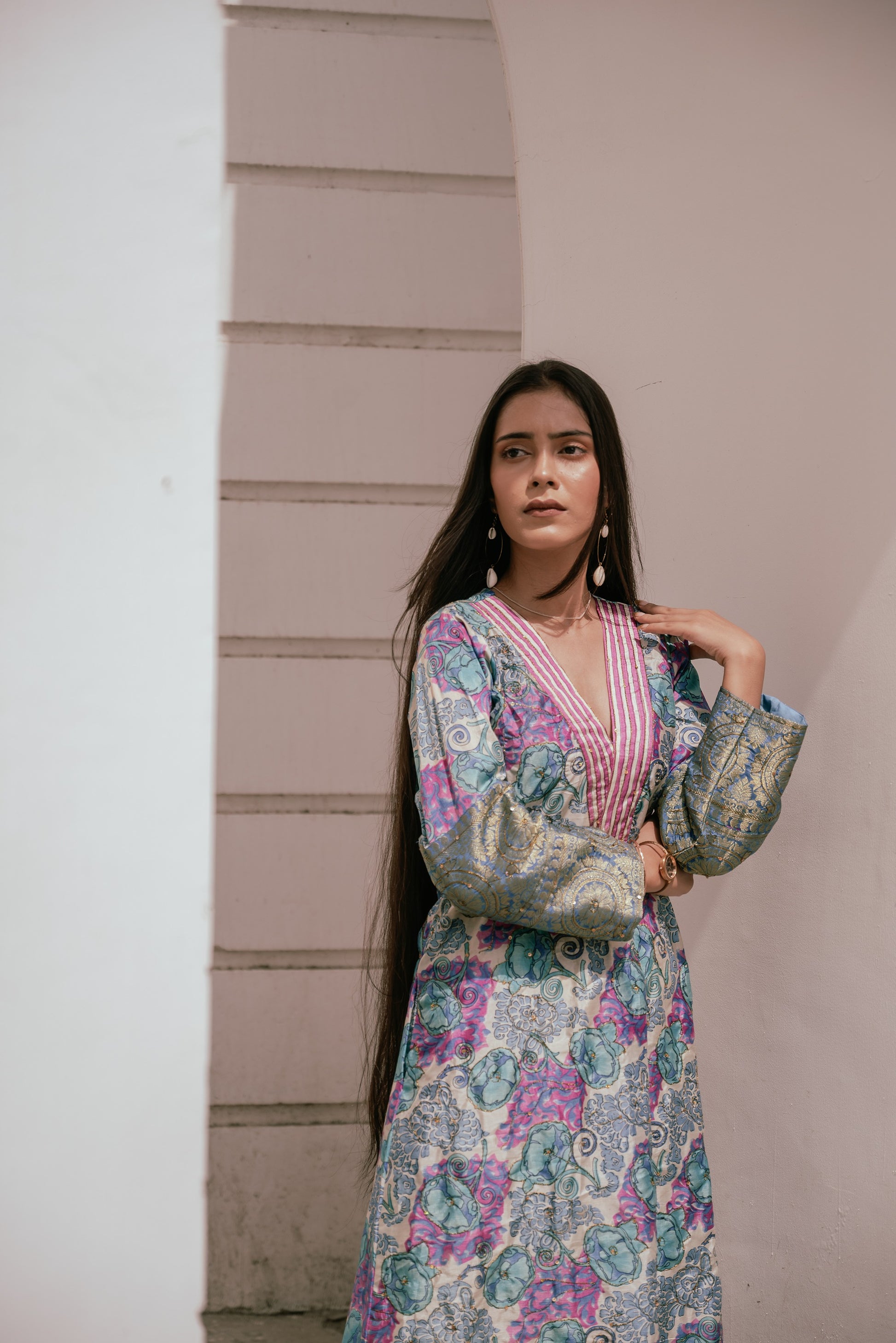 The easy A-line kurta with floral prints and zari highlights with side pockets. Sleeves are embellished with Banarasi border. It is paired with classic ivory pants