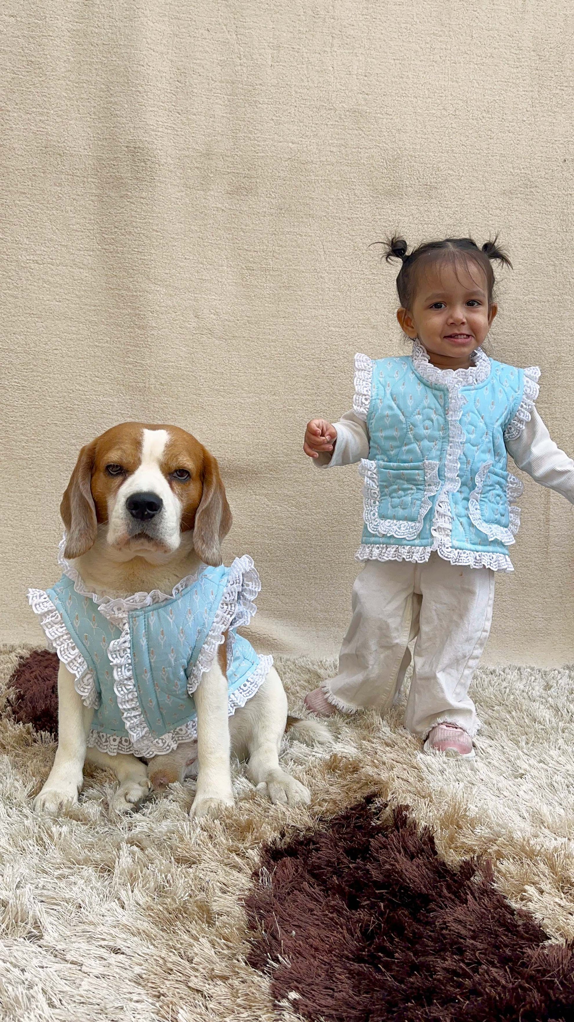 This combo includes a Floral Blue Quilted vest with lace frill trim for Dog and a Floral Blue Quilted vest with lace frill trim for baby.