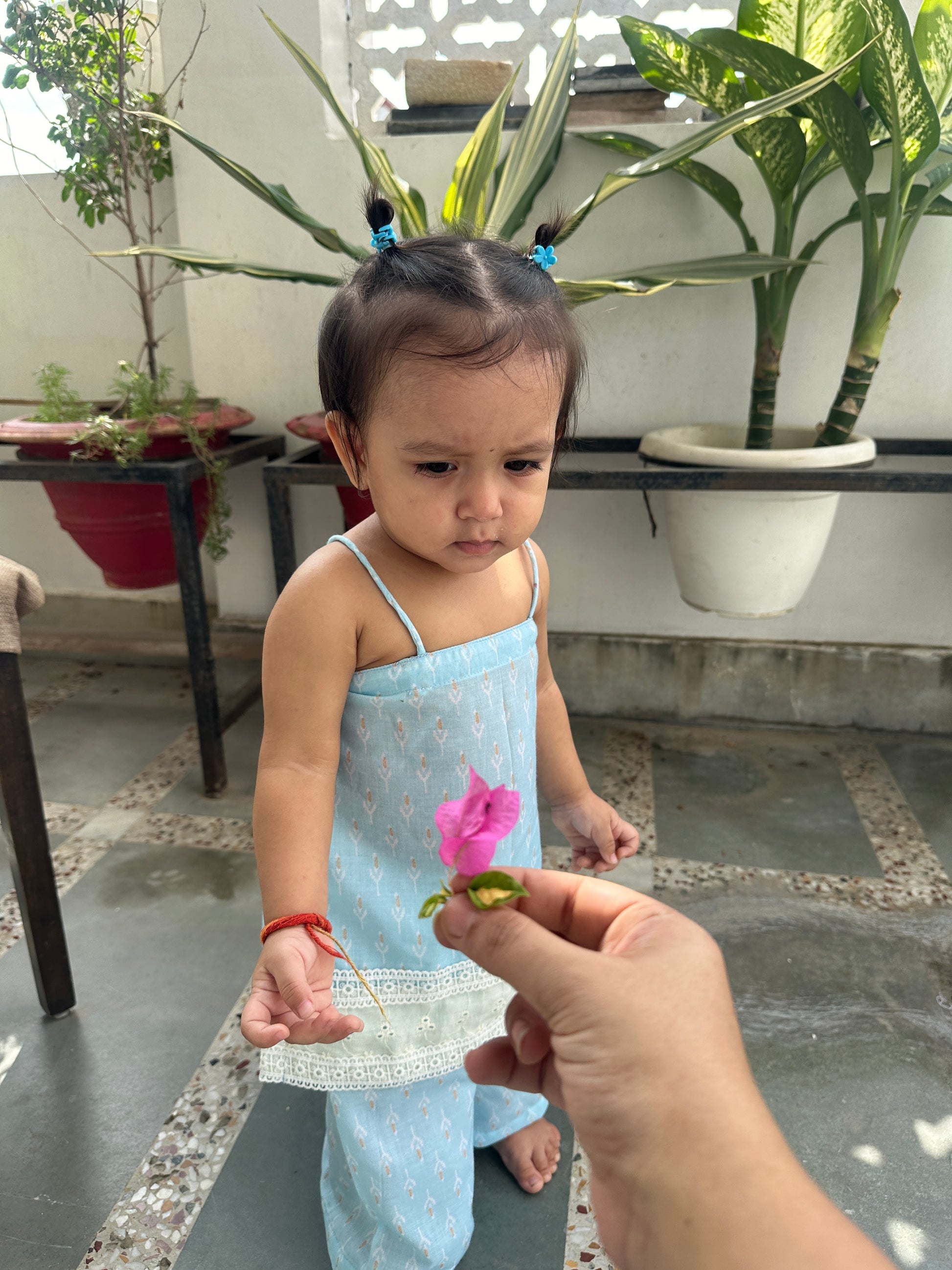 A charming summer festive outfit for your little one—this blue noodle-strap kurta set with palazzo features delicate schiffli work, making it a breezy and elegant choice for celebrations and special occasions.
