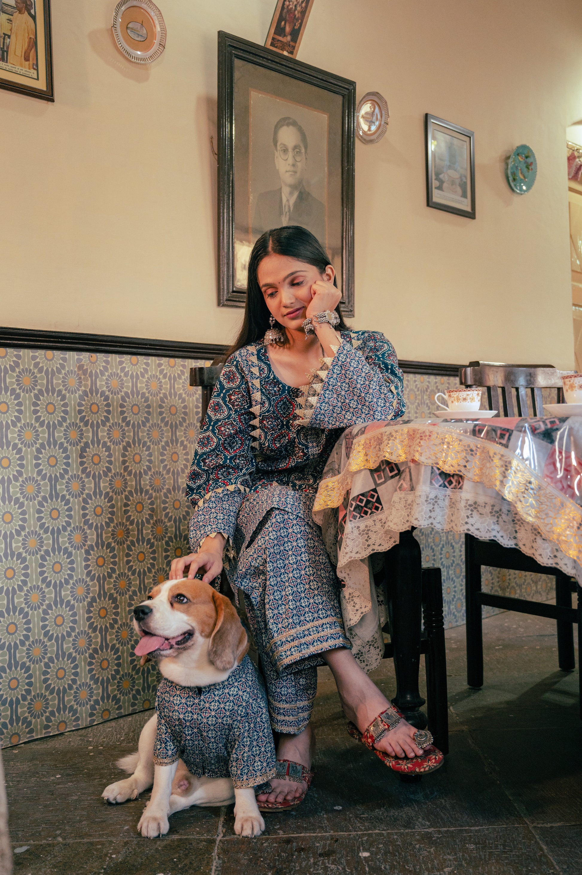 The blue ajrakh print Pakistani straight fit kurta set is adorned with gota lace work, adding a touch of elegance. Paired with straight fit pants with gota work at the hem making it a perfect choice for any special occasion.