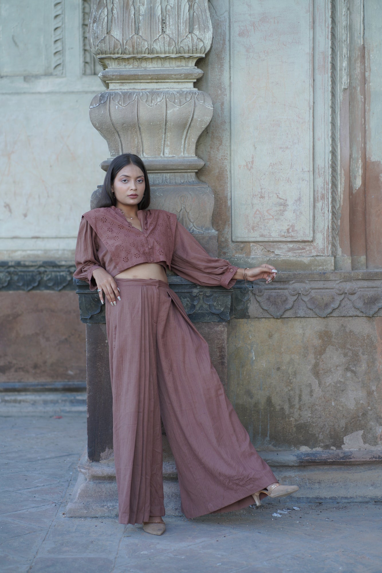 Co-ord with pleated flayered pants and crop top designed for comfort and flair. The top has an additional Schiffli flap detail.