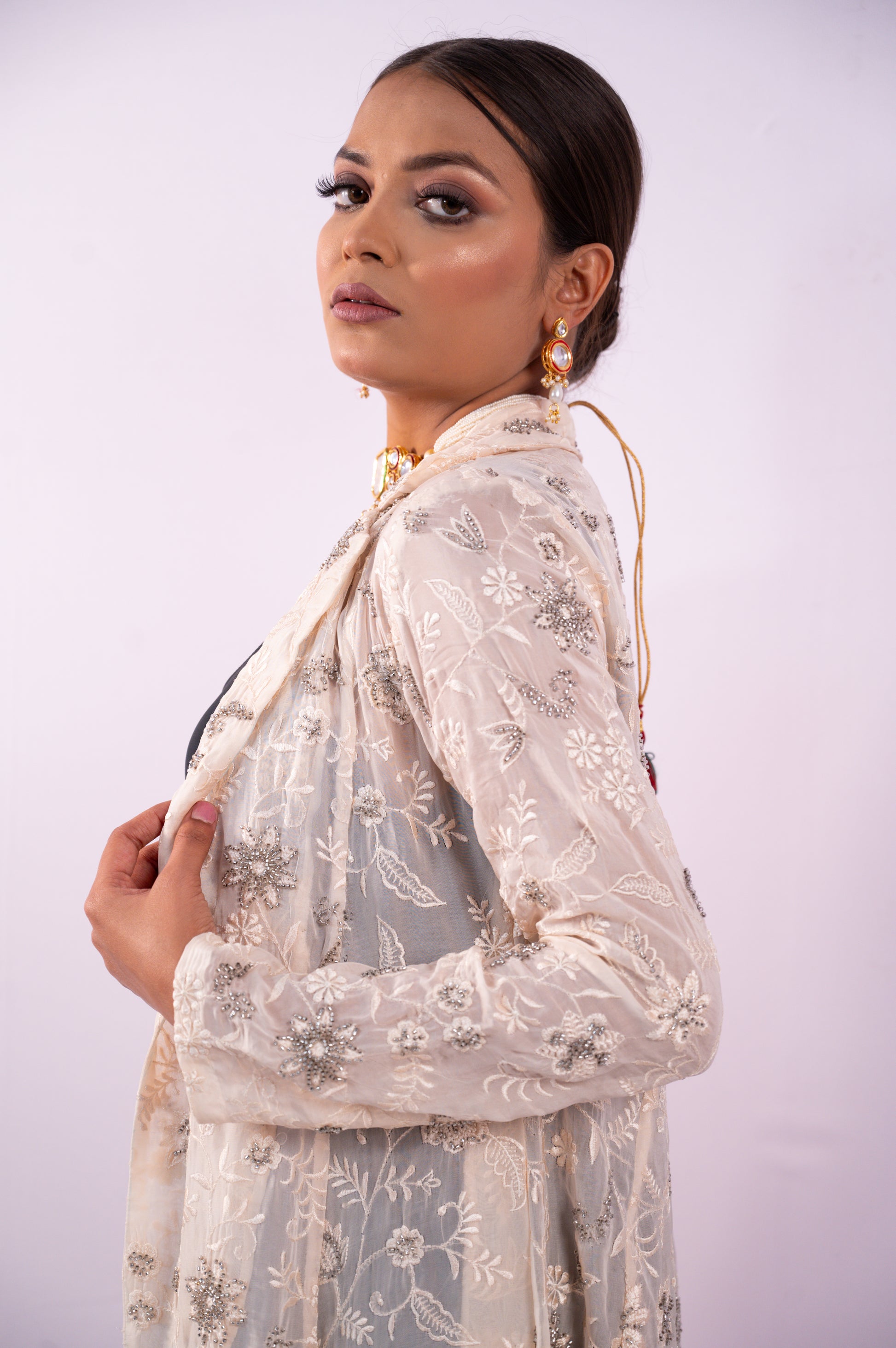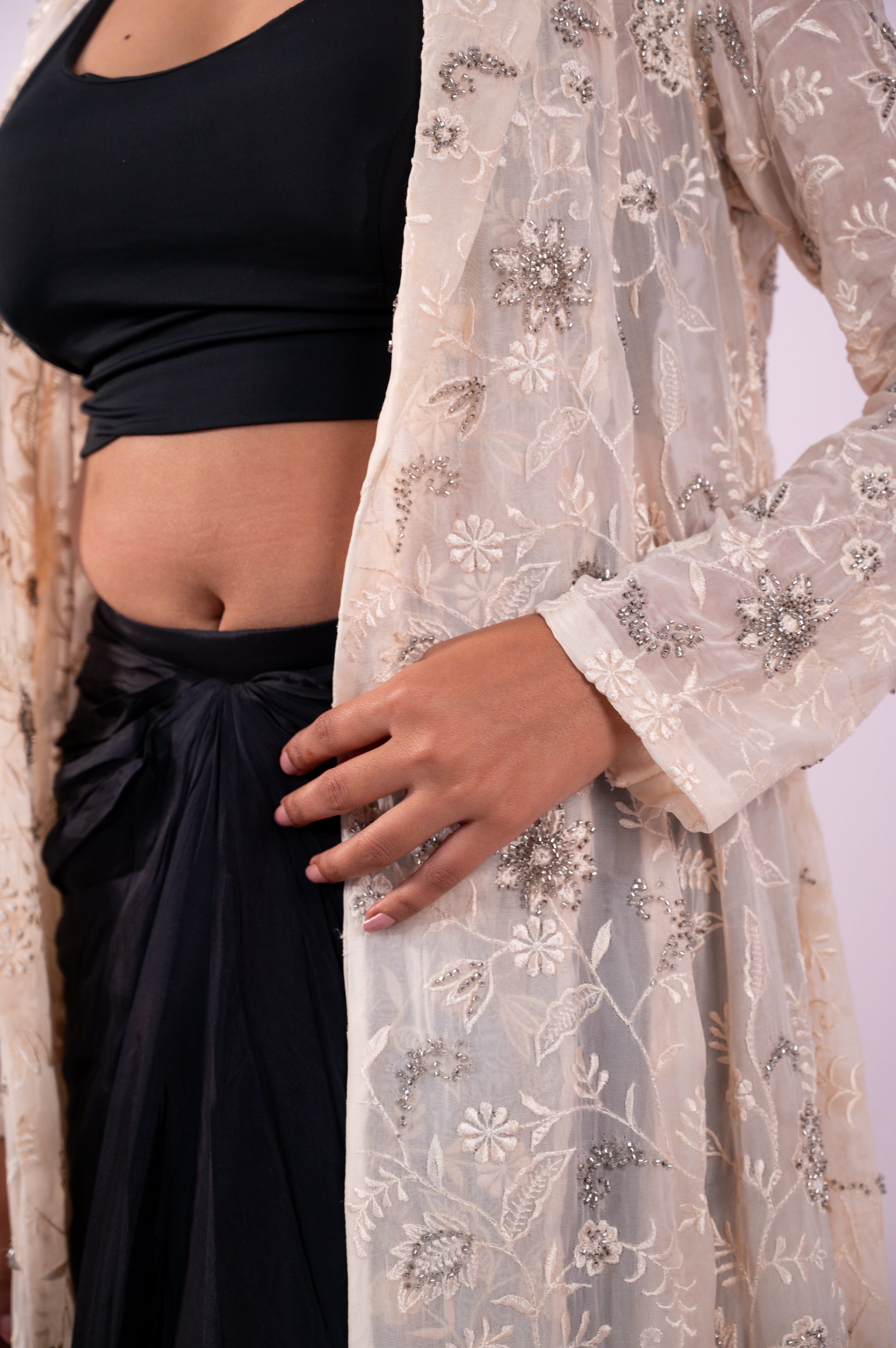 Black & White signature draped skirt and cape set. This trio set features a black blouse, an off-white embroidered organza cape paired perfectly with our draped skirt.