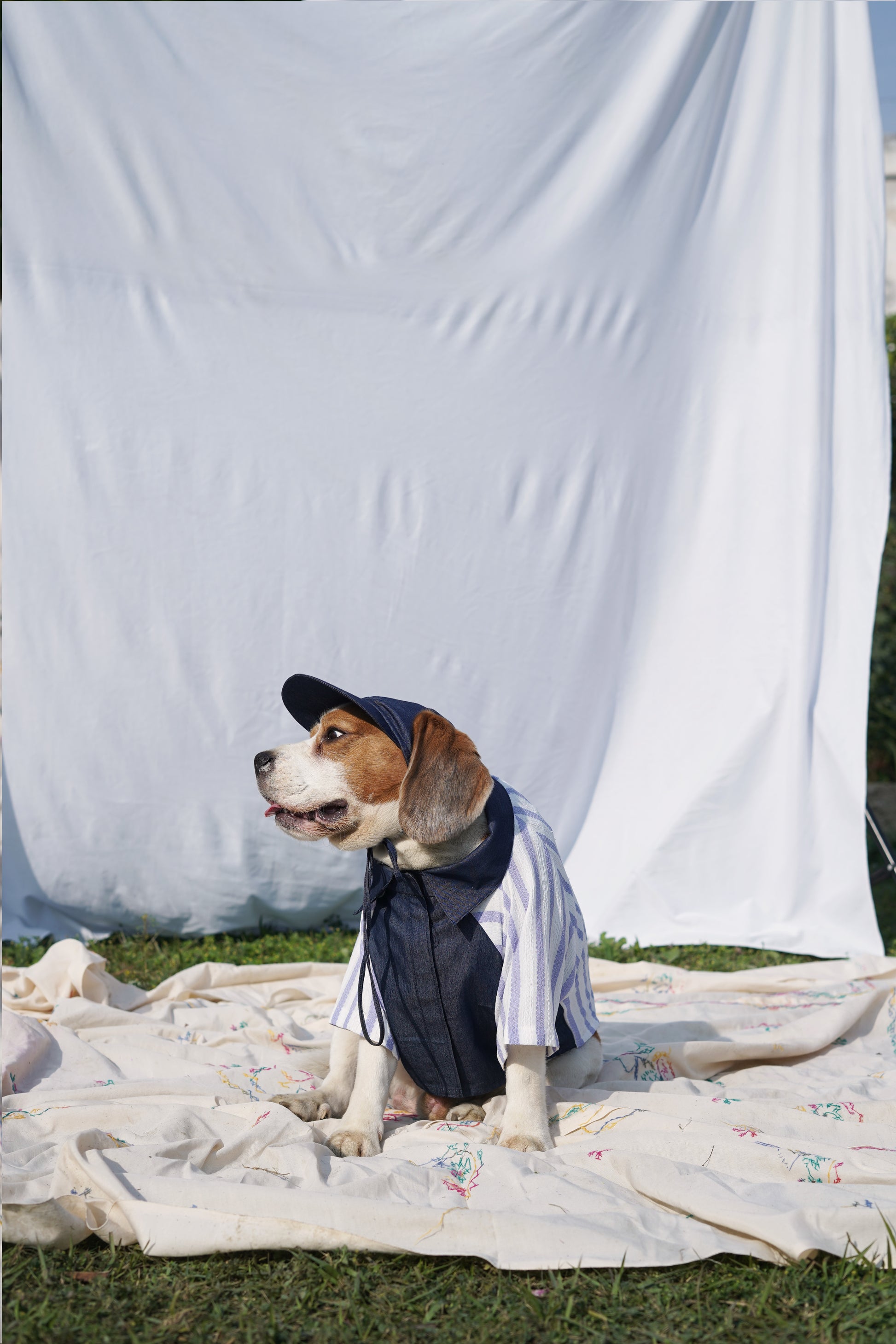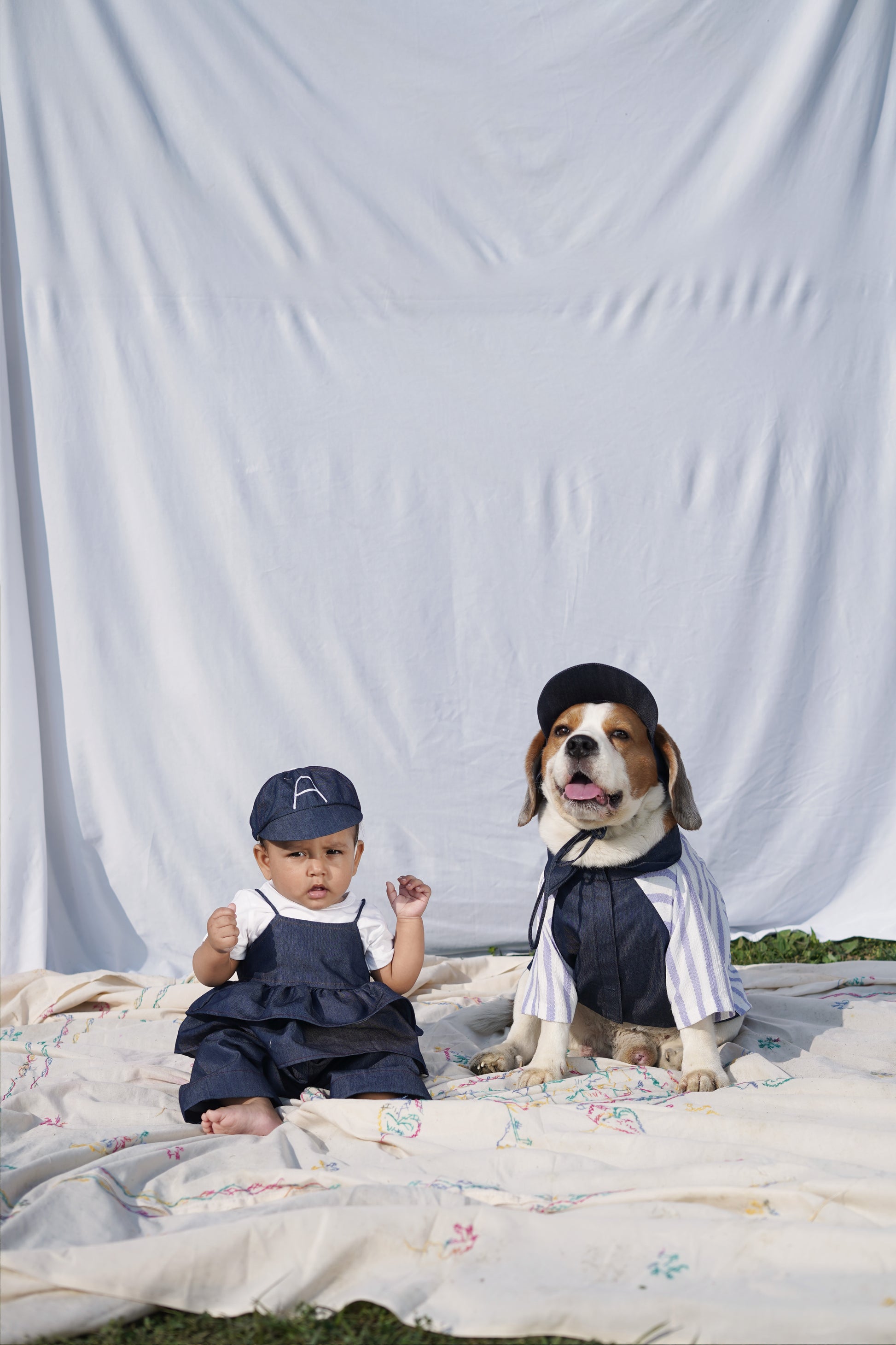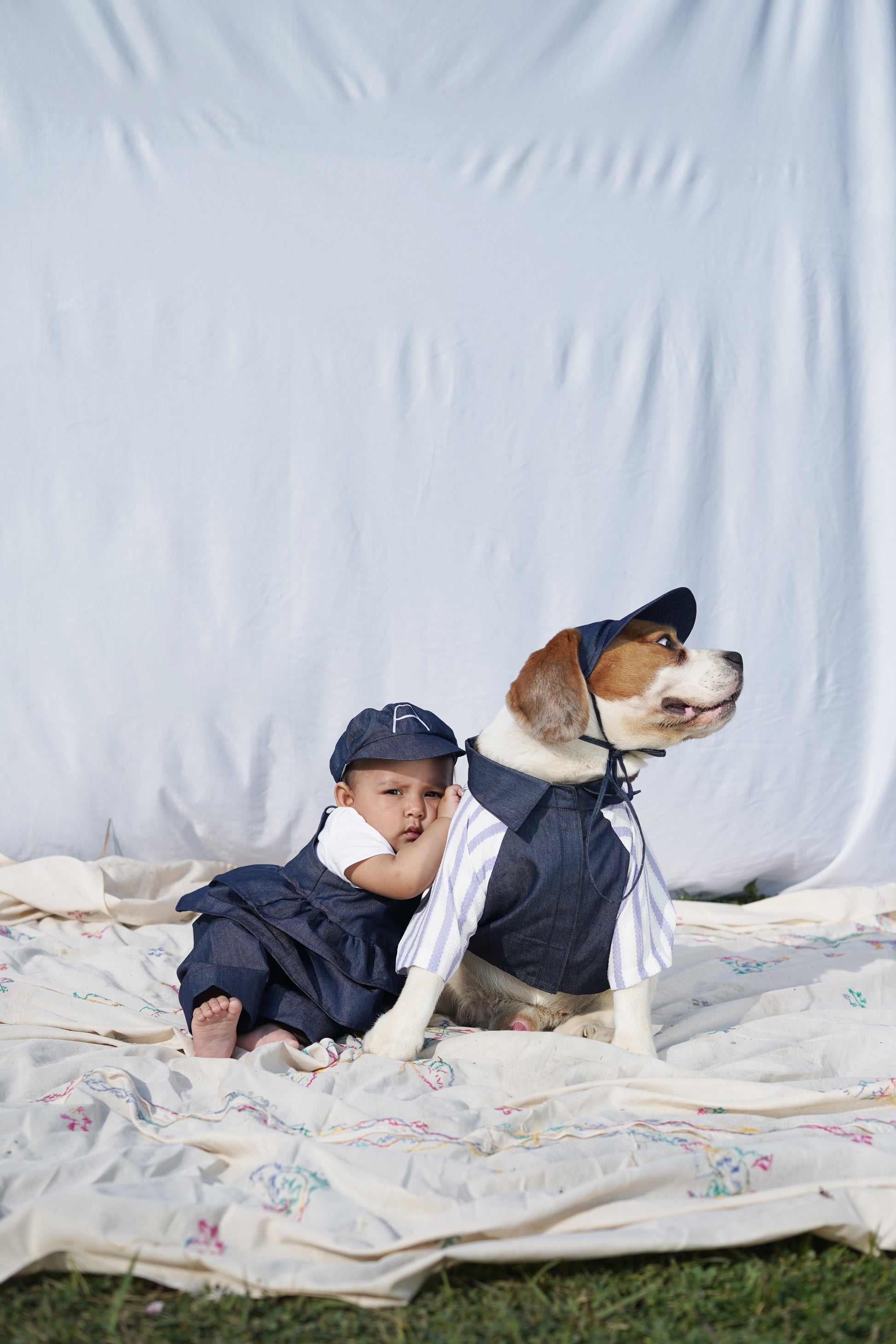 This combo includes a denim shirts with cap for Dog and a denim co-ord with cap with matching underpants and headband for baby