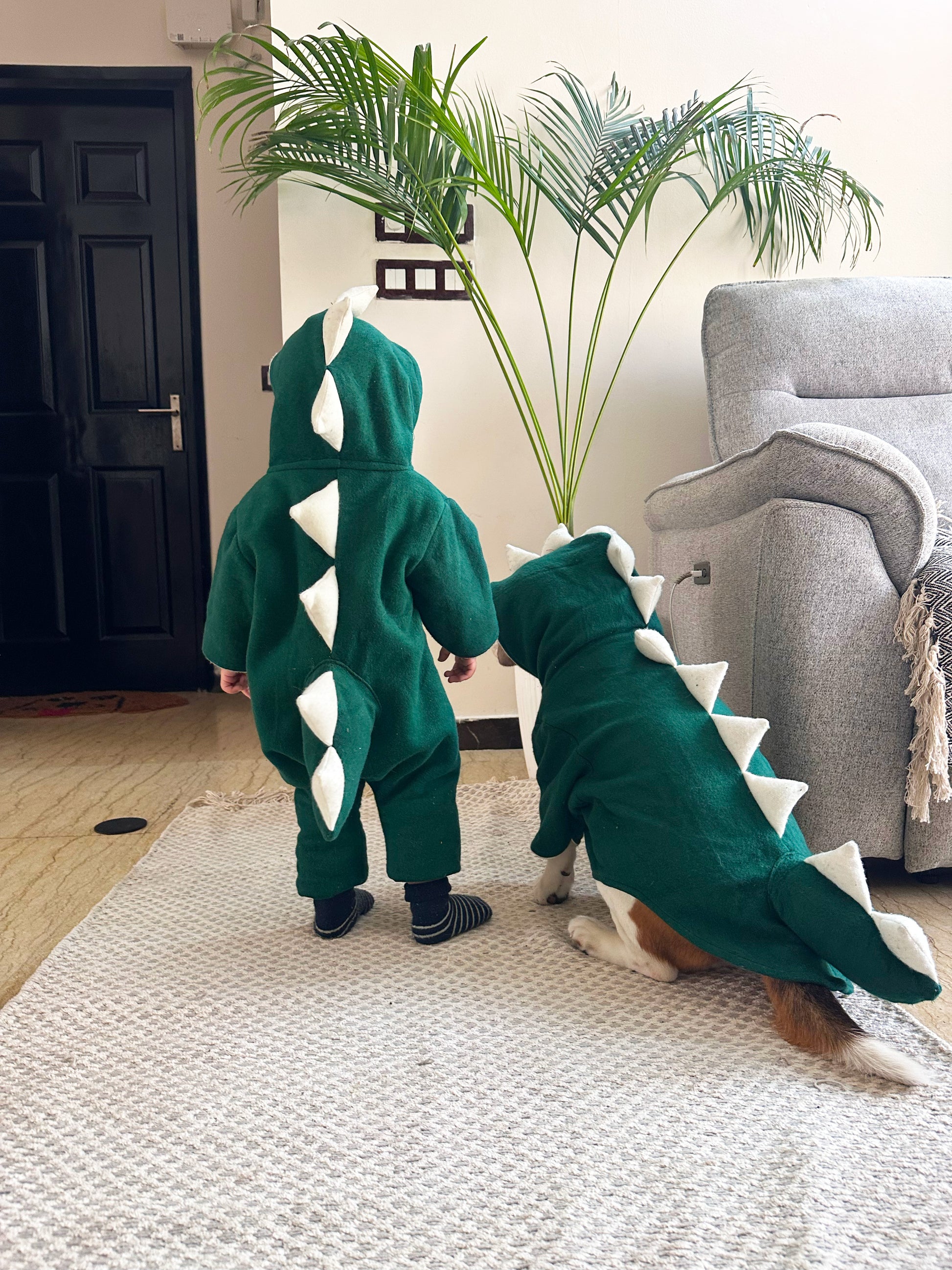 This combo includes a Green Dinosaur Hoodie for Dog and a Green Dinosaur romper for baby.