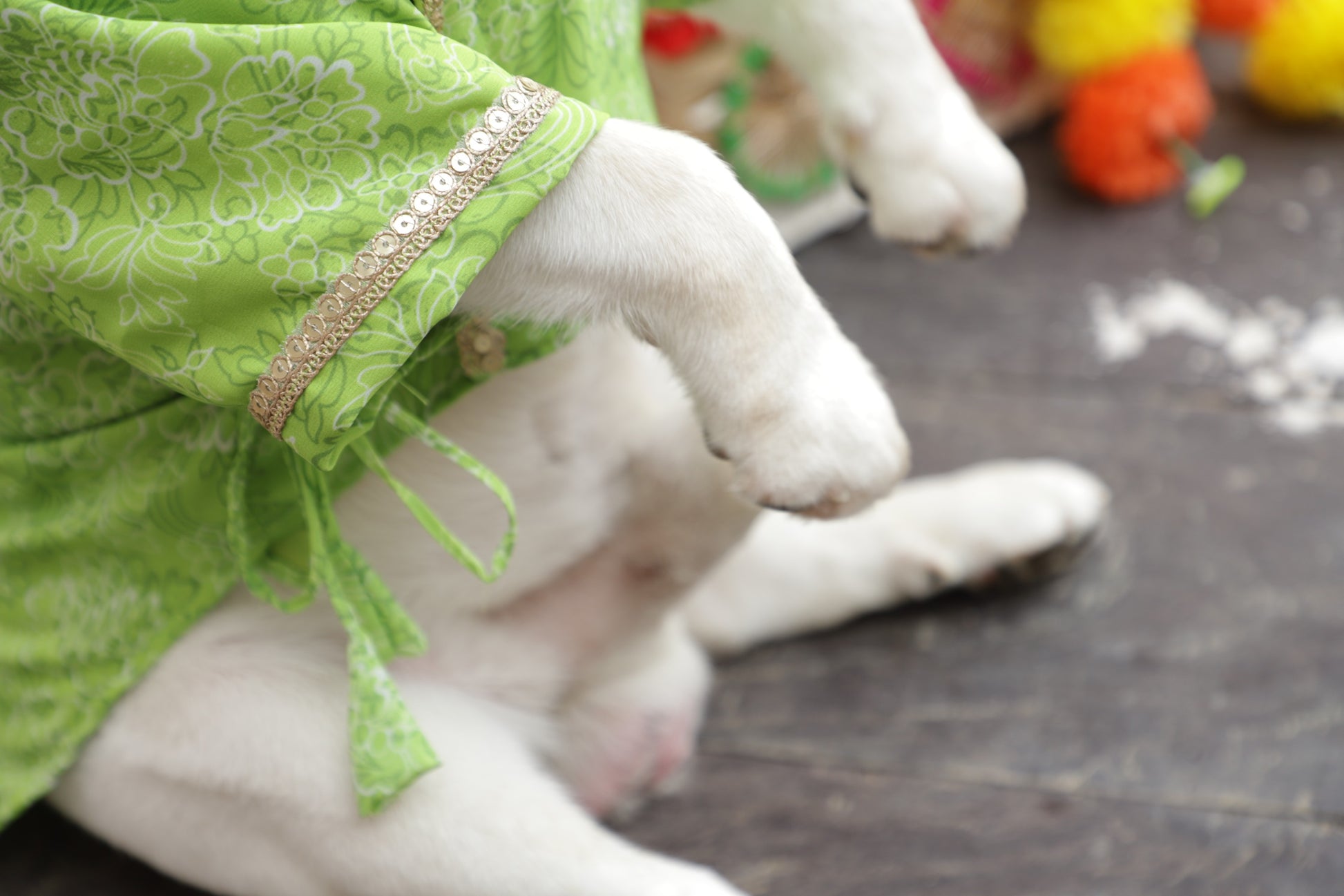 Elevate your dog’s style with our Green Floral print Angrakha Kurta Set, featuring exquisite embroidered borders and an elegant side wrap. Perfect for festive occasions, this outfit combines comfort with stunning sophistication!
