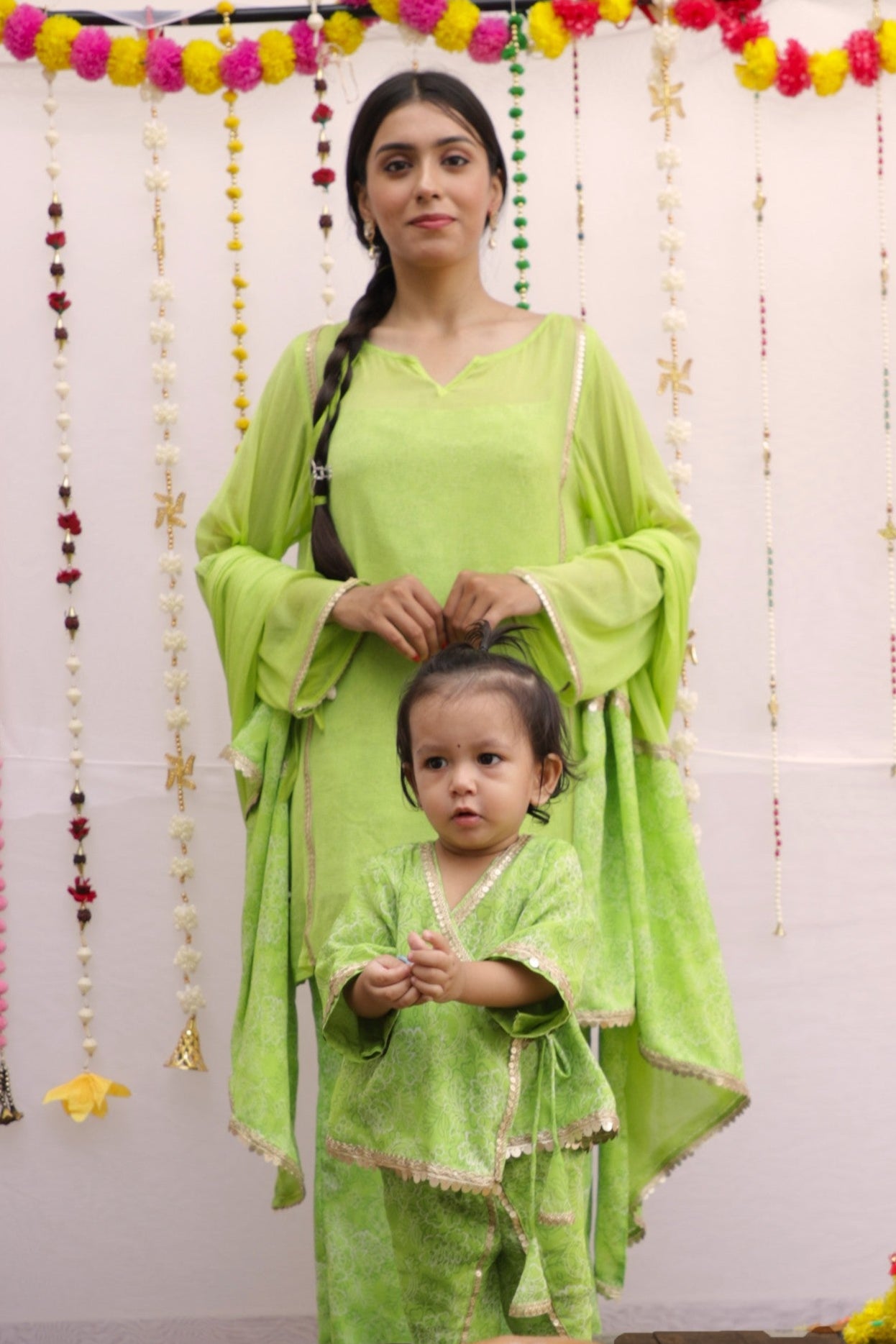 This combo includes an Green Shirt Kurta set for her and Angrakha Kurta set for baby.