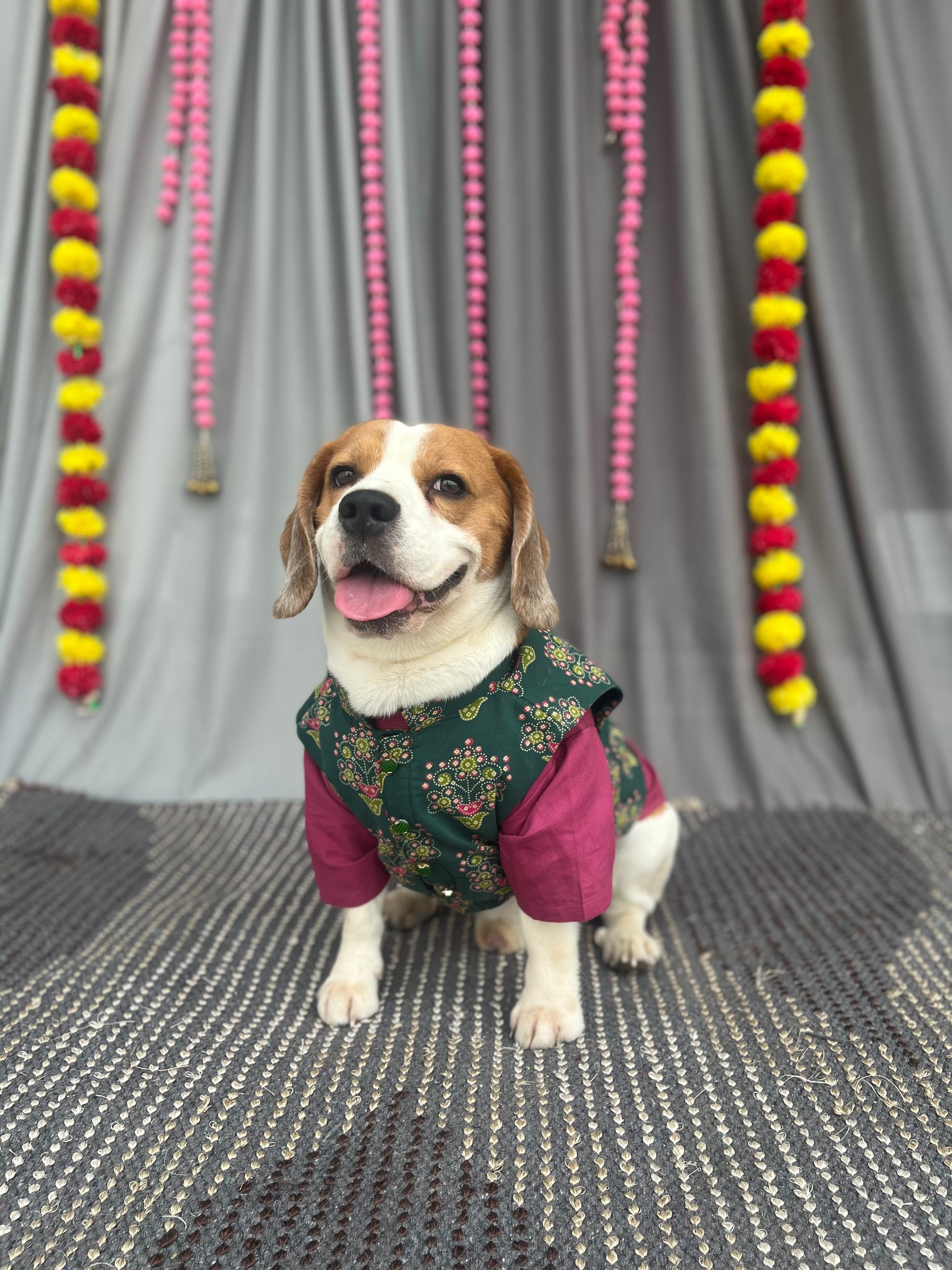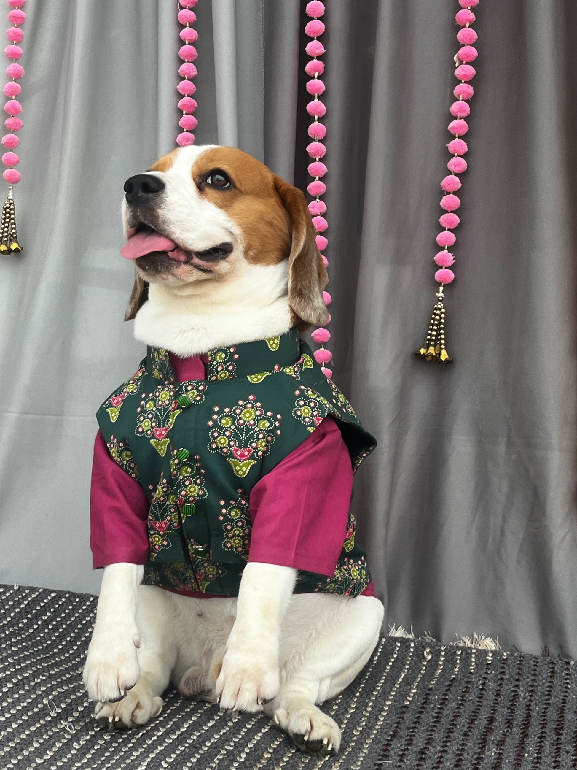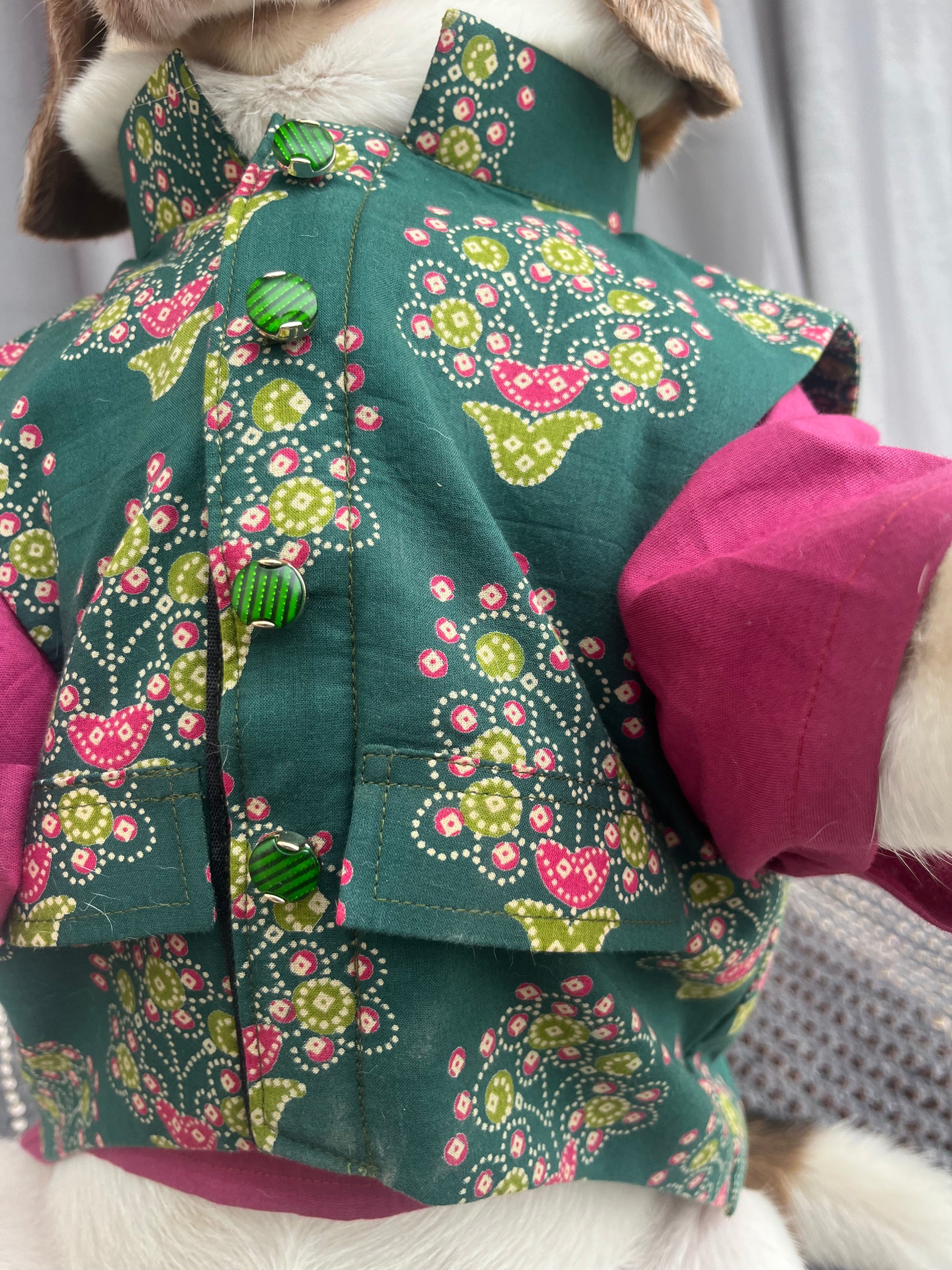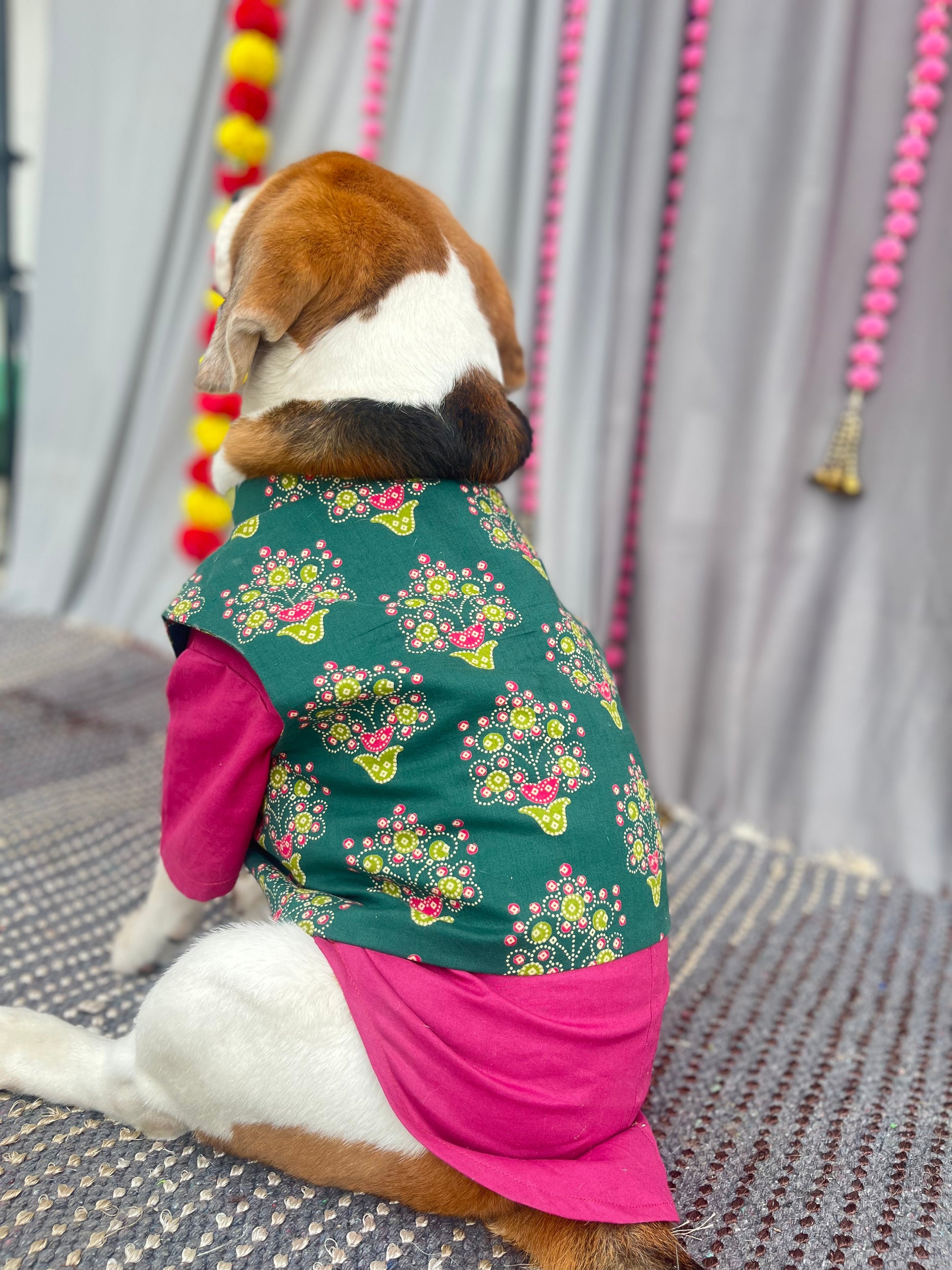 Elevate your pup’s style with our Green Colour Blocked Jacket Kurta set, featuring printed sidari with flap pockets and contrasting Kurta—perfect for festive occasions! this stylish outfit ensures comfort and elegance.