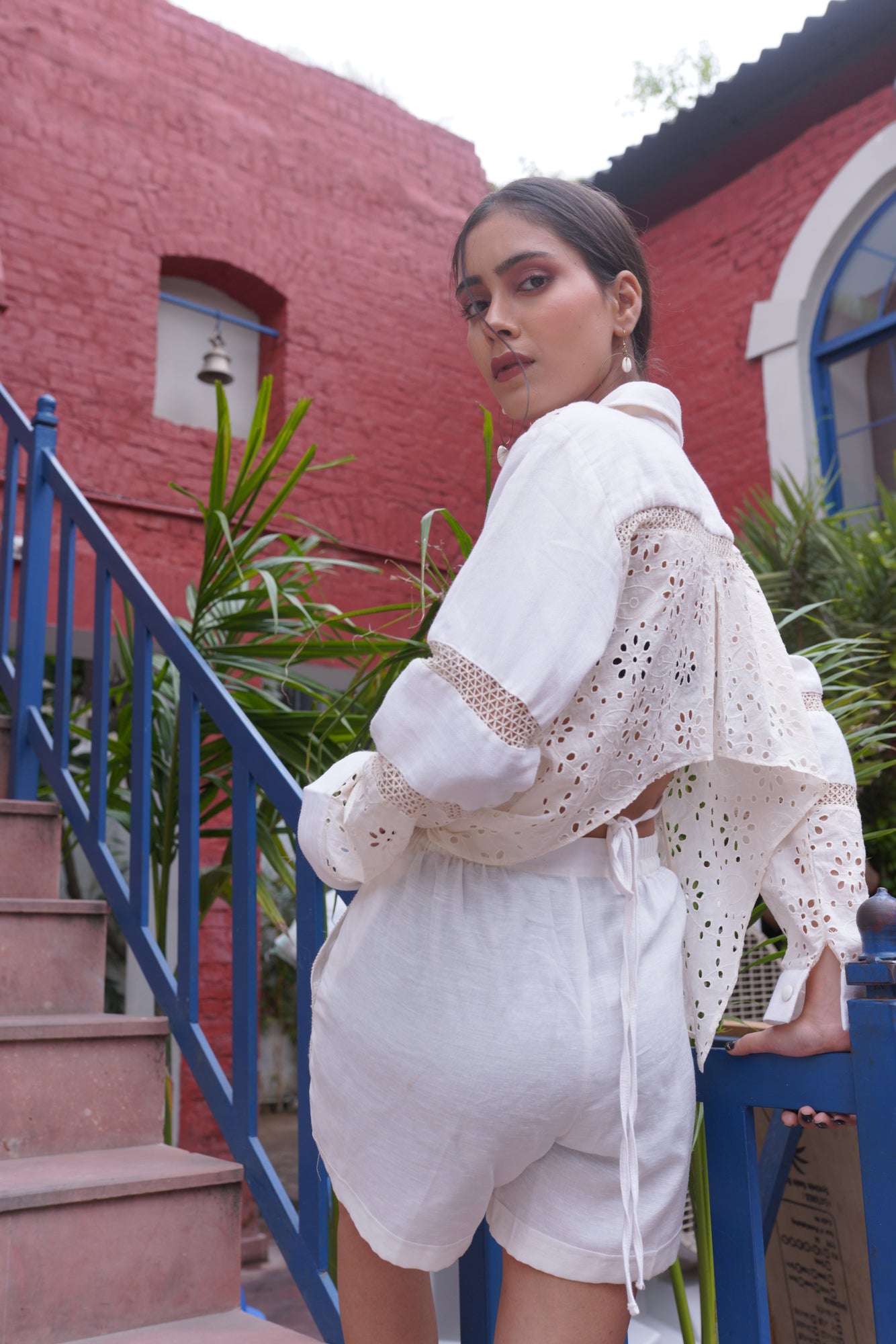 Relaxed co-ord set with low cut back schiffli mix shirt and shorts.