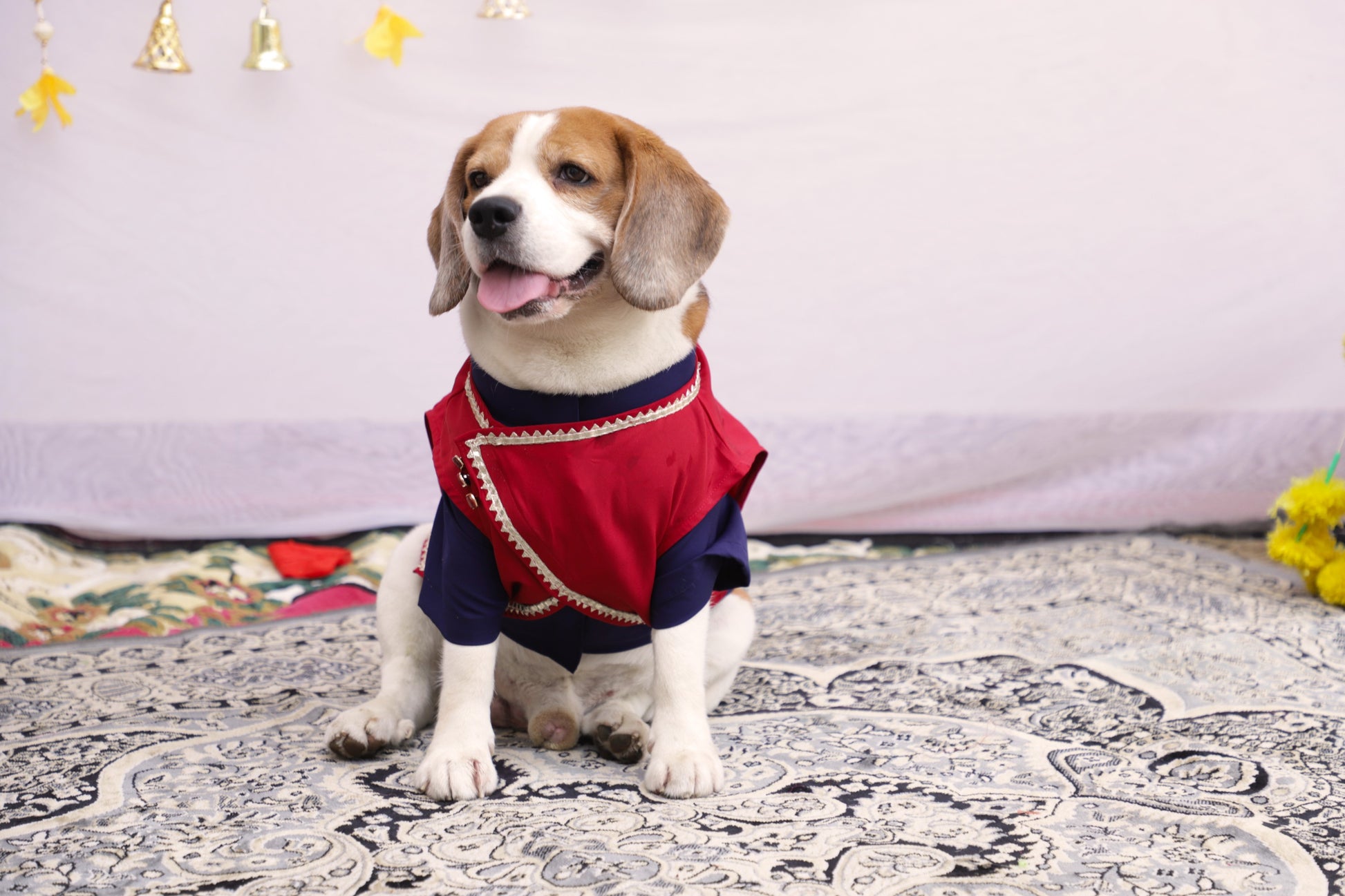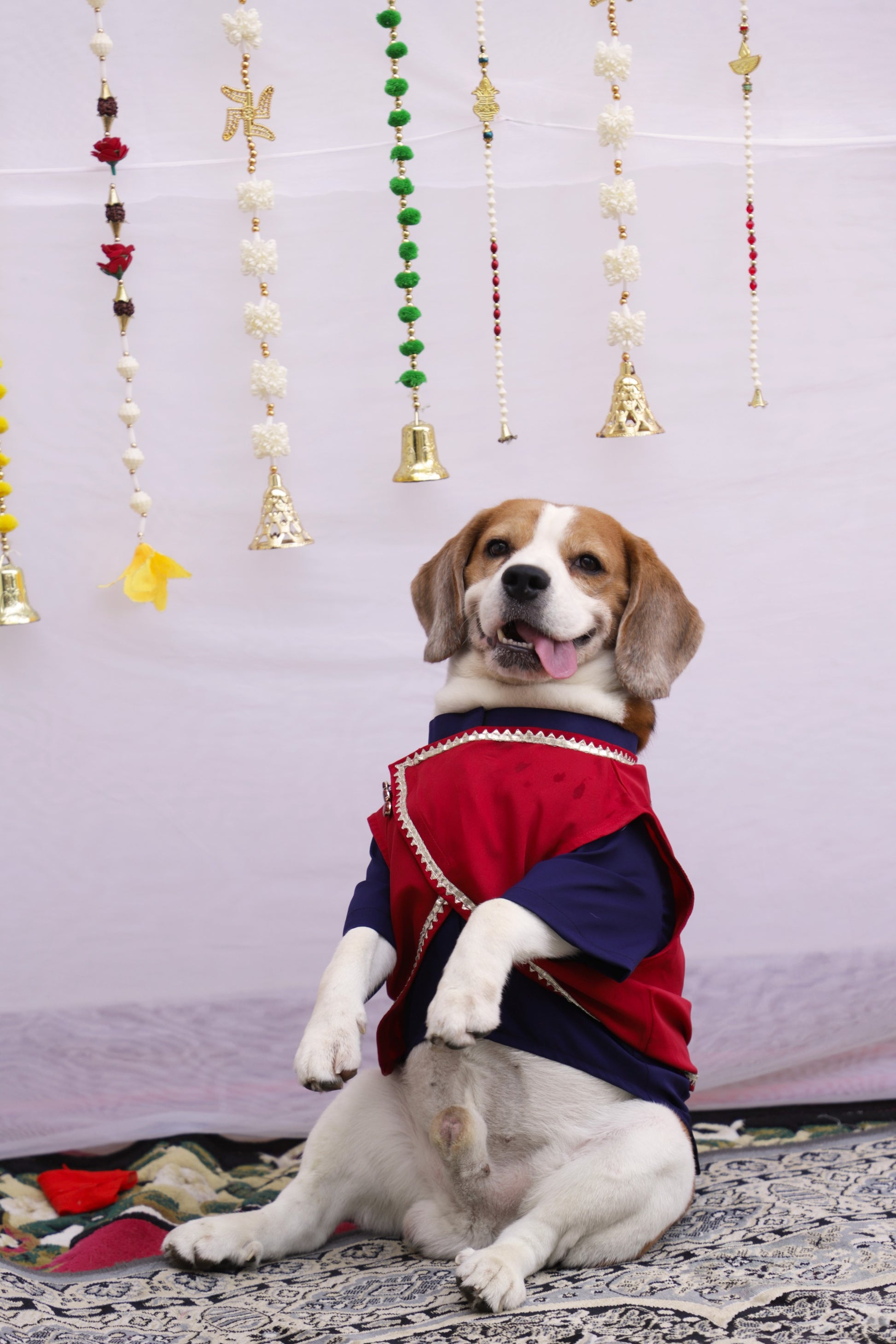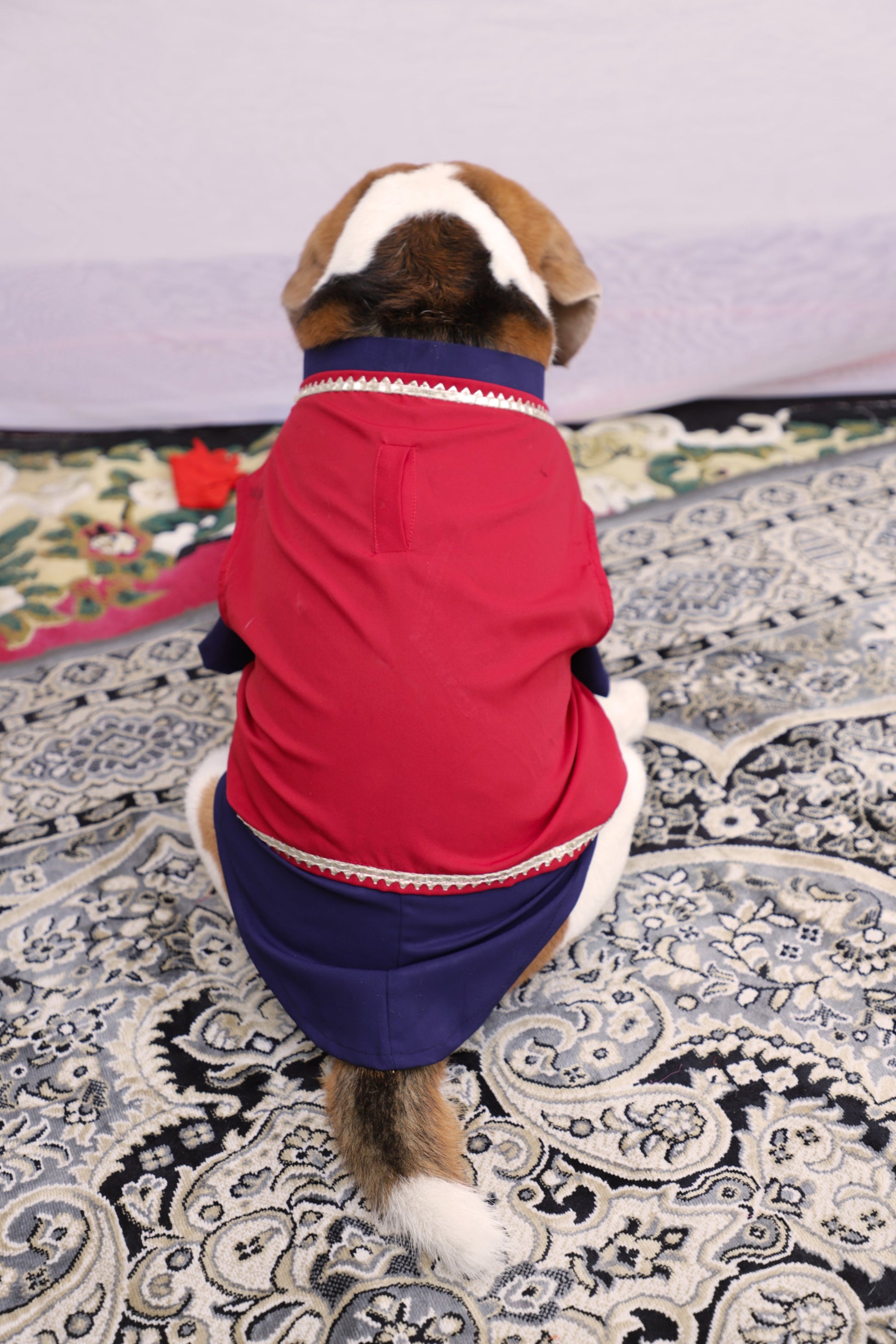 Elevate your pup’s style with our Navy Blue Overlay Nehru Jacket Kurta set, featuring Detachable Red Nehru Jacket with lace work—perfect for festive occasions! this stylish outfit ensures comfort and elegance.