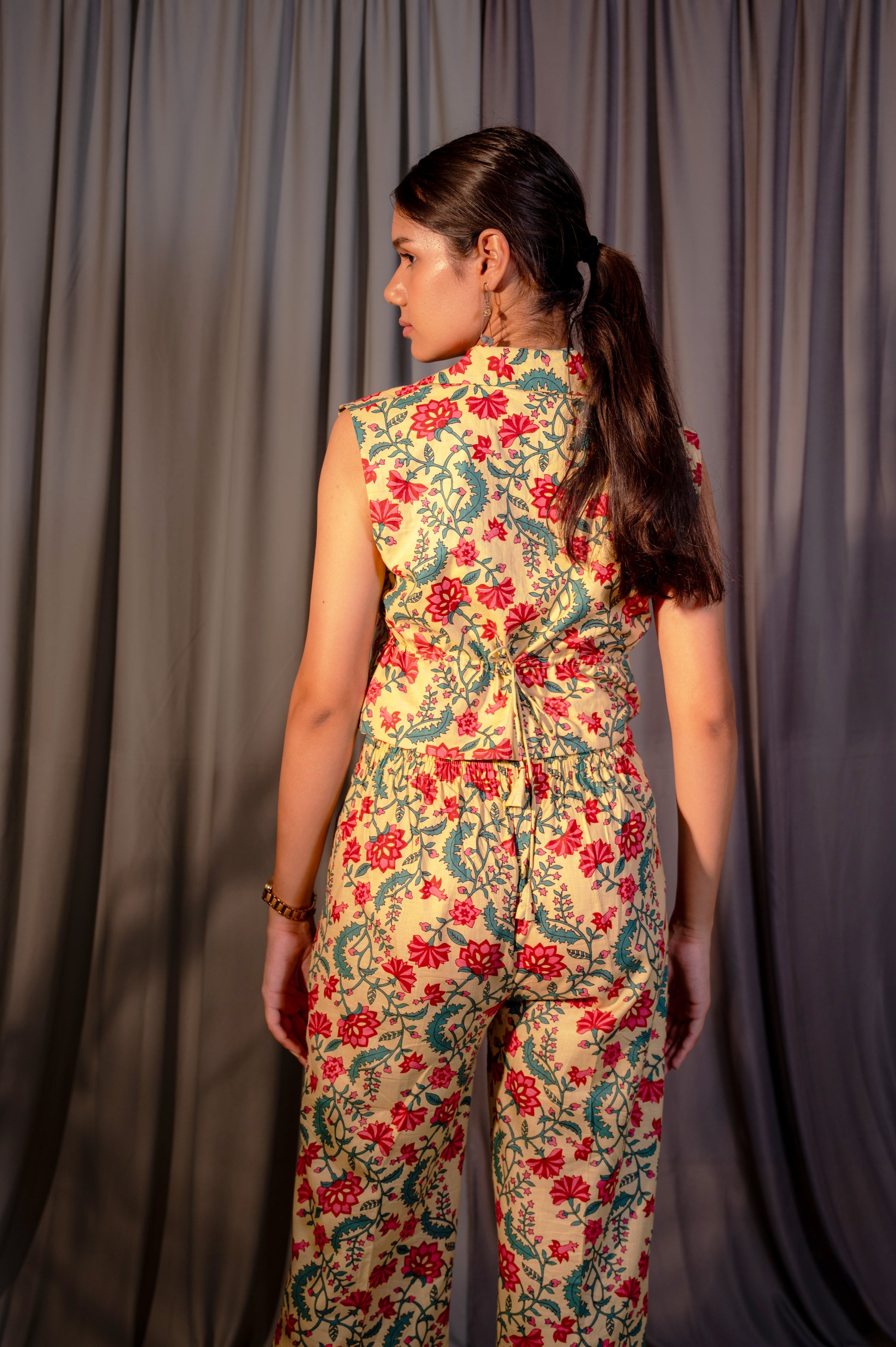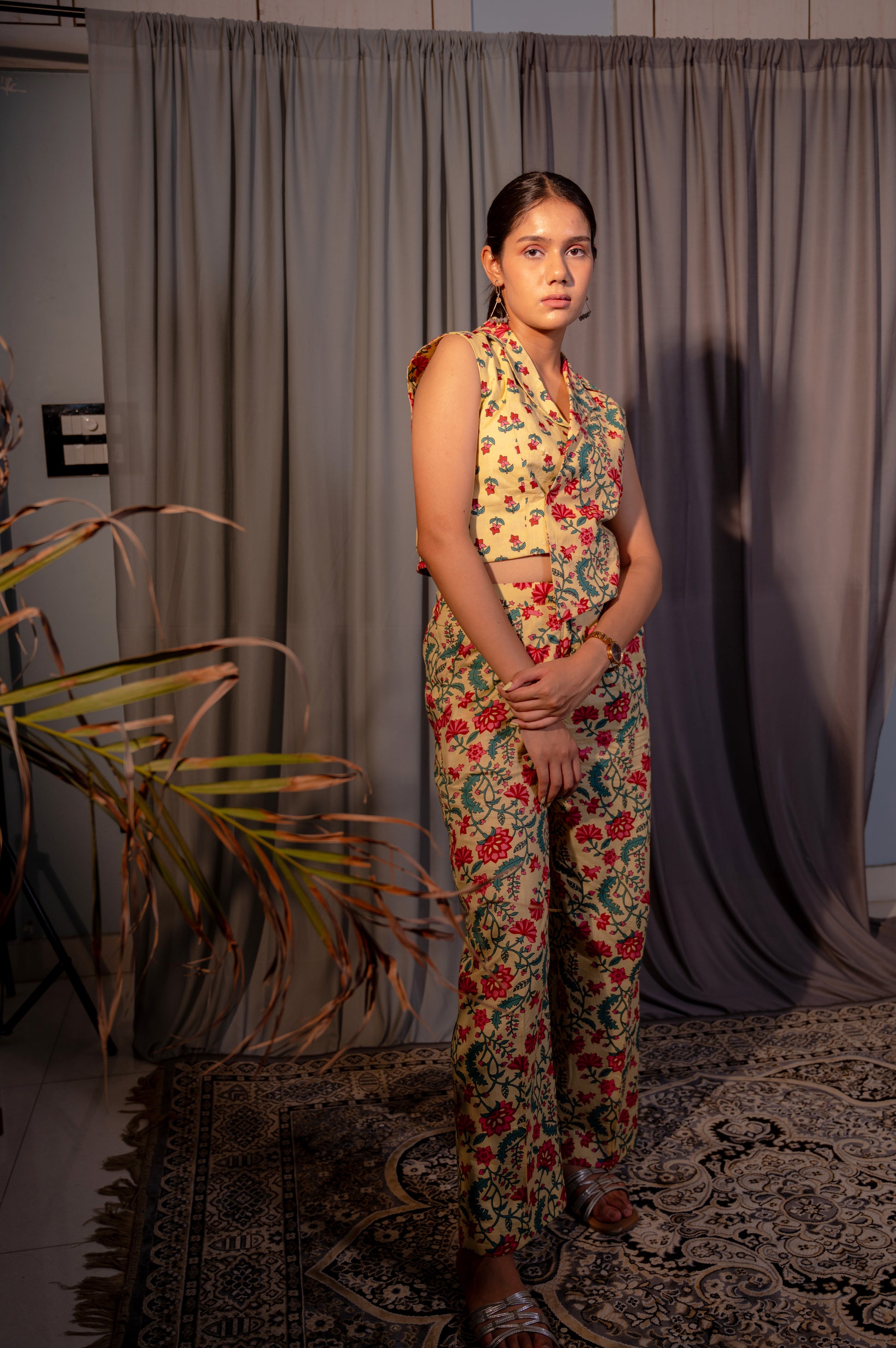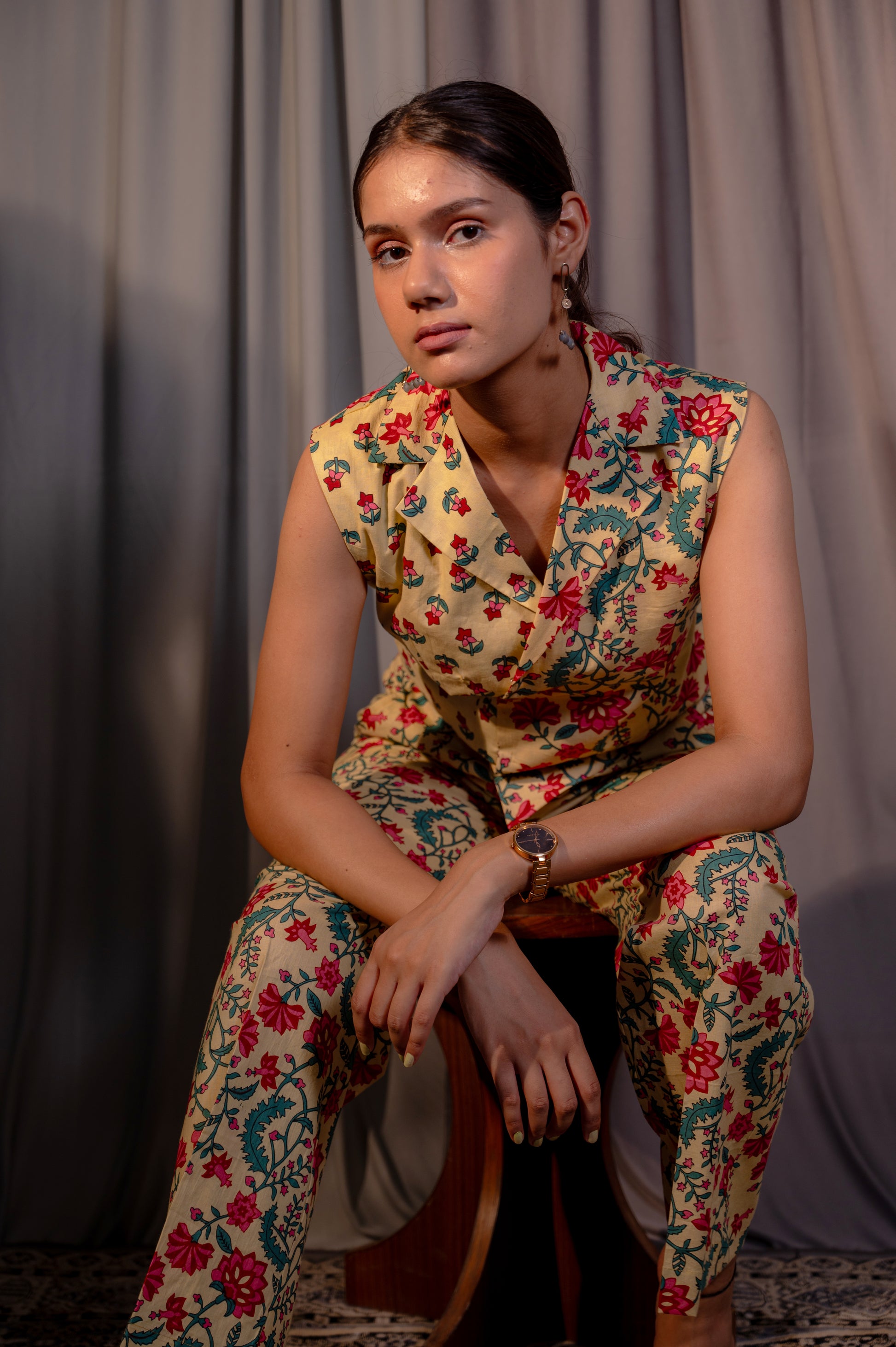 The vest coord set exudes sophistication with its notch collar double-breasted design, featuring a string detail at the back for added style. Paired with complimentary printed pants in a Beige colour scheme with floral prints on cotton fabric, this ensemble offers a chic and versatile look for any occasion.