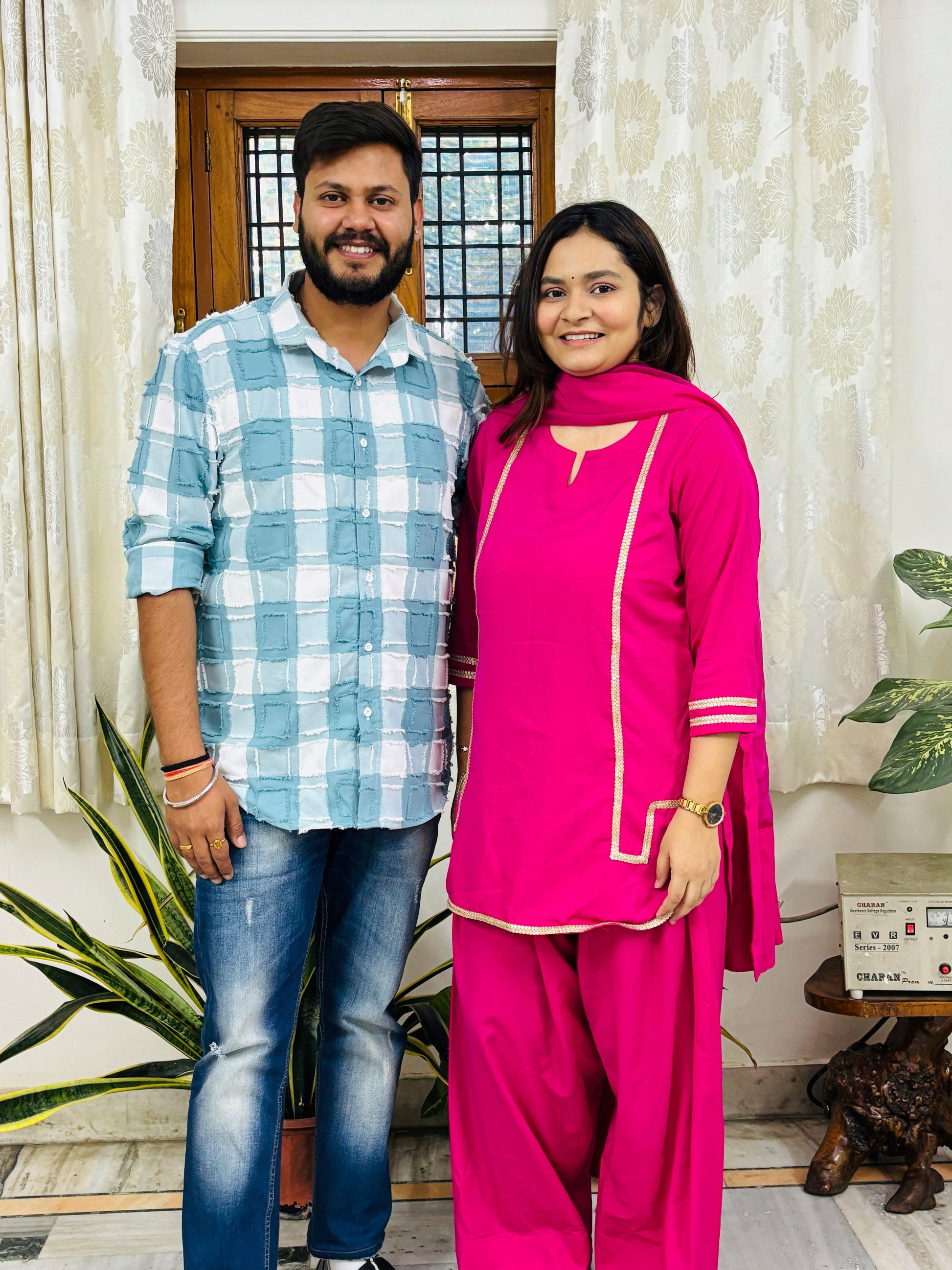 Radiate festive charm in our Rani Farshi Salwar Suit Set, adorned with elegant zari lace detailing. This vibrant ensemble blends traditional grace with comfort, making it a perfect pick for celebratory occasions and joyful gatherings.