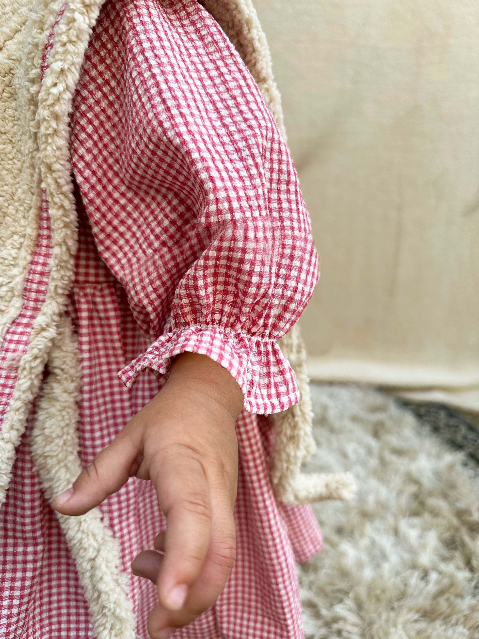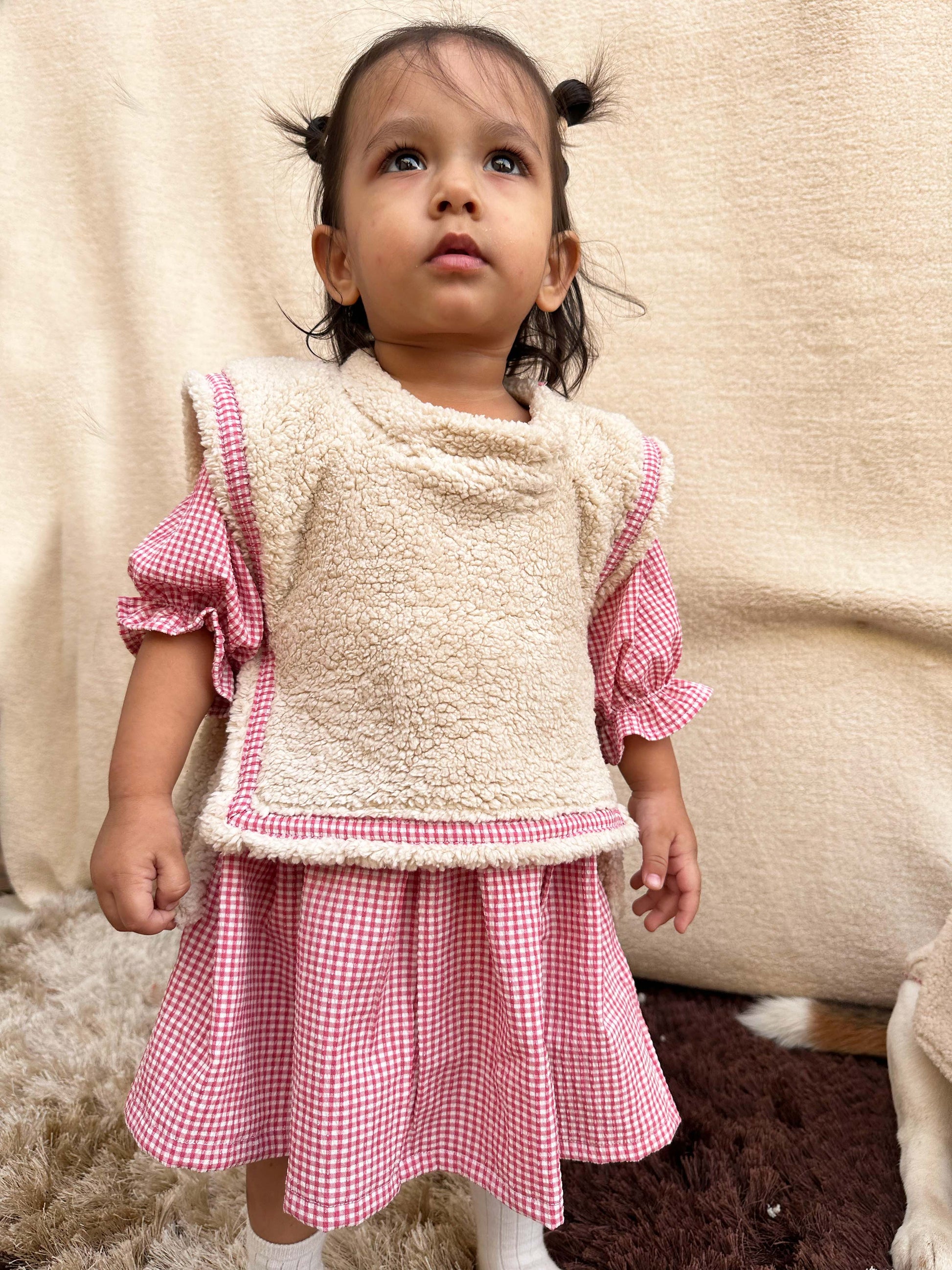 Round neck long sleeve Dress with elastic cuffs. Contrasting Red checked detail. Superimposed fur fleece with round neck and sleeveless design. Side tie details.