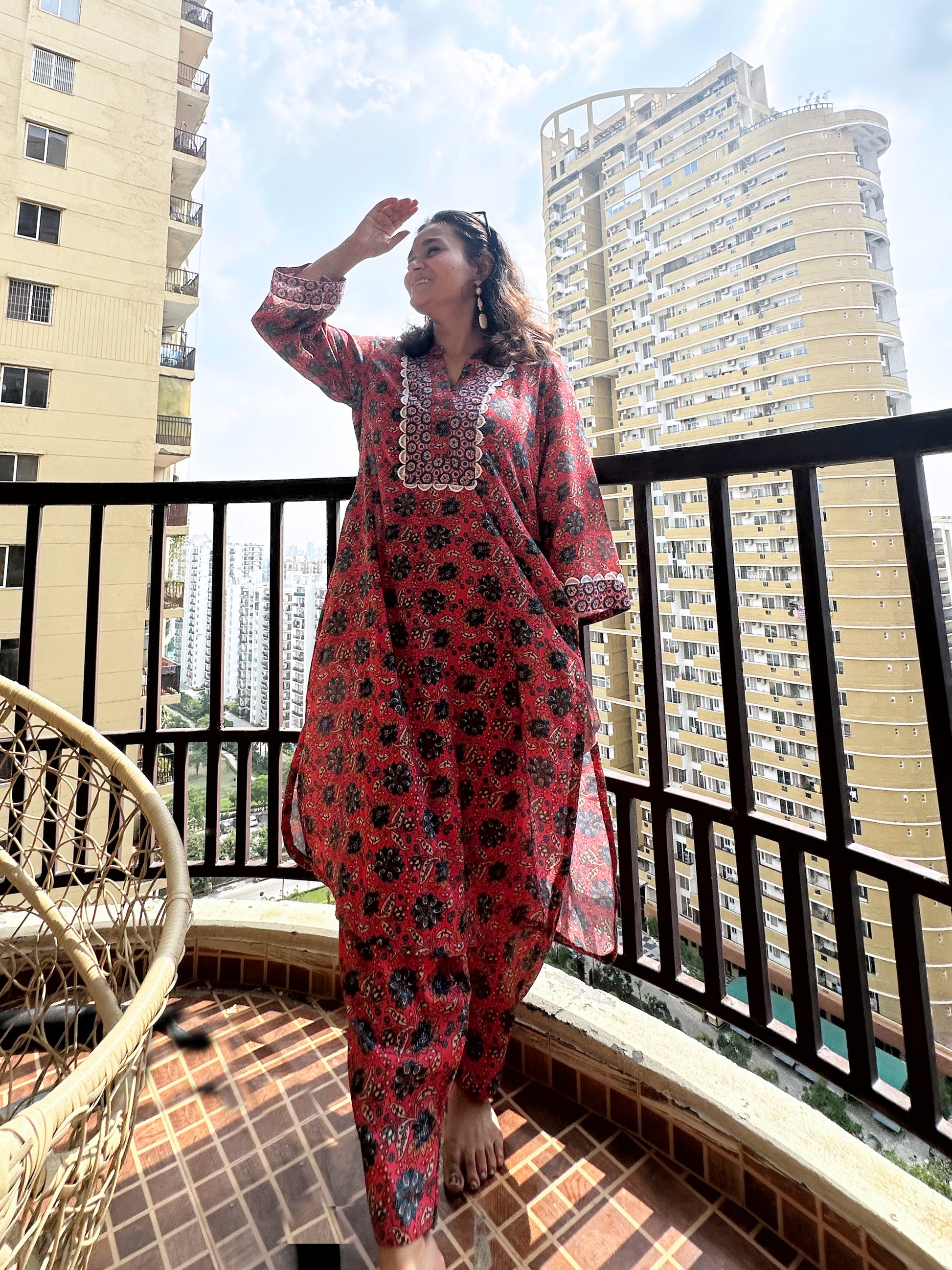 Radiate festive charm in our Red floral Salwar Suit Set, adorned with elegant lace detailing. This vibrant ensemble blends traditional grace with comfort, making it a perfect pick for celebratory occasions and joyful gatherings.