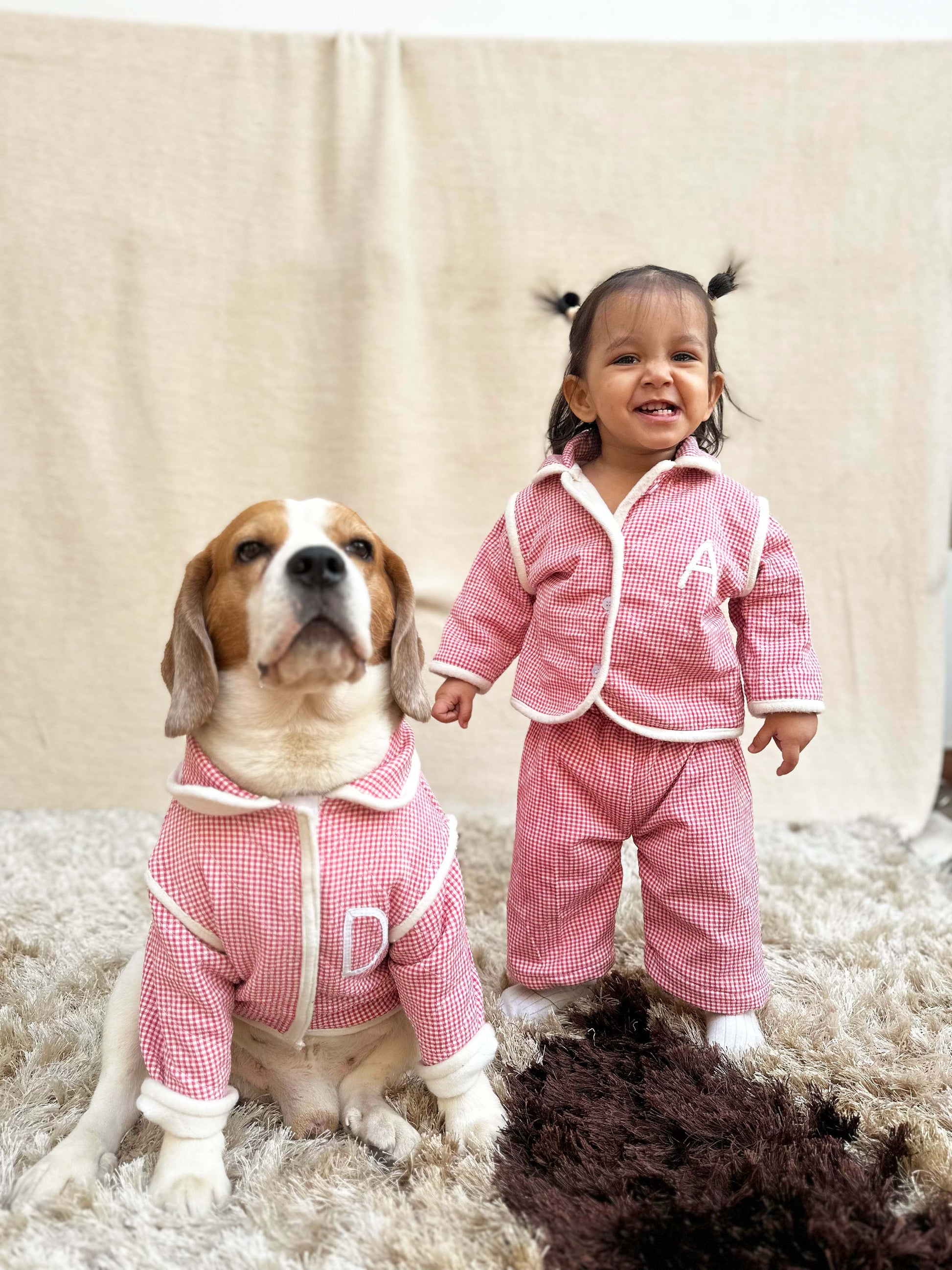 This combo includes a Red Checked Quilted Shirt for Dog and a Red Checked quilted co-ord for baby with customised Initial.