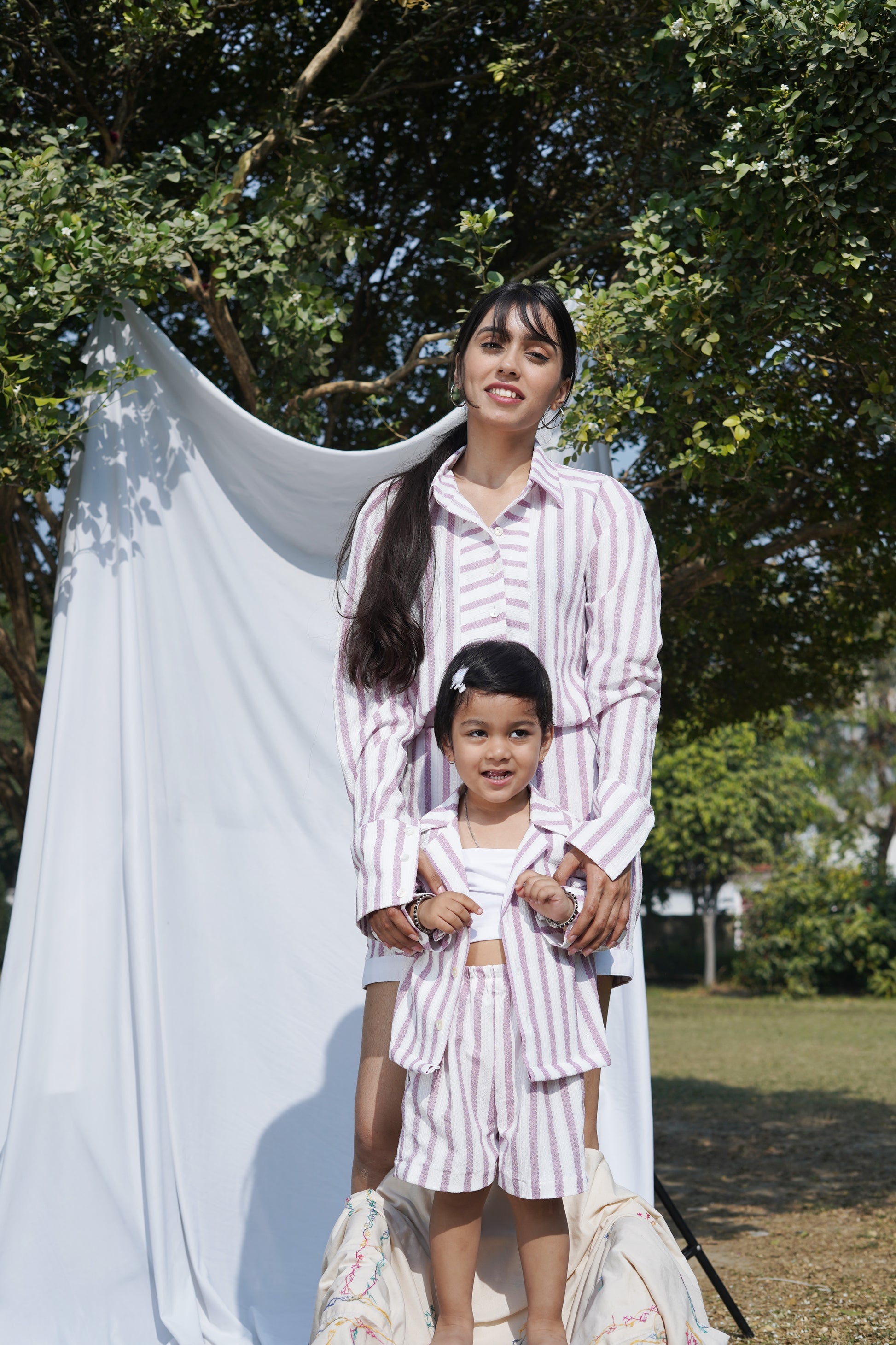 This combo includes a striped shirt co-ord set for her and a stripe co-ord for baby