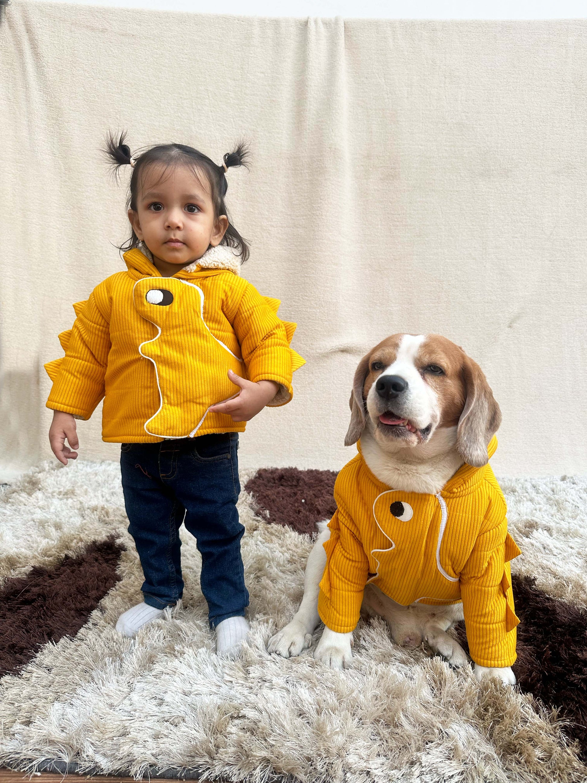 This combo includes a Yellow Dinosaur padded Hoodie jacket for Dog and a Yellow Dinosaur padded Hoodie jacket for baby.