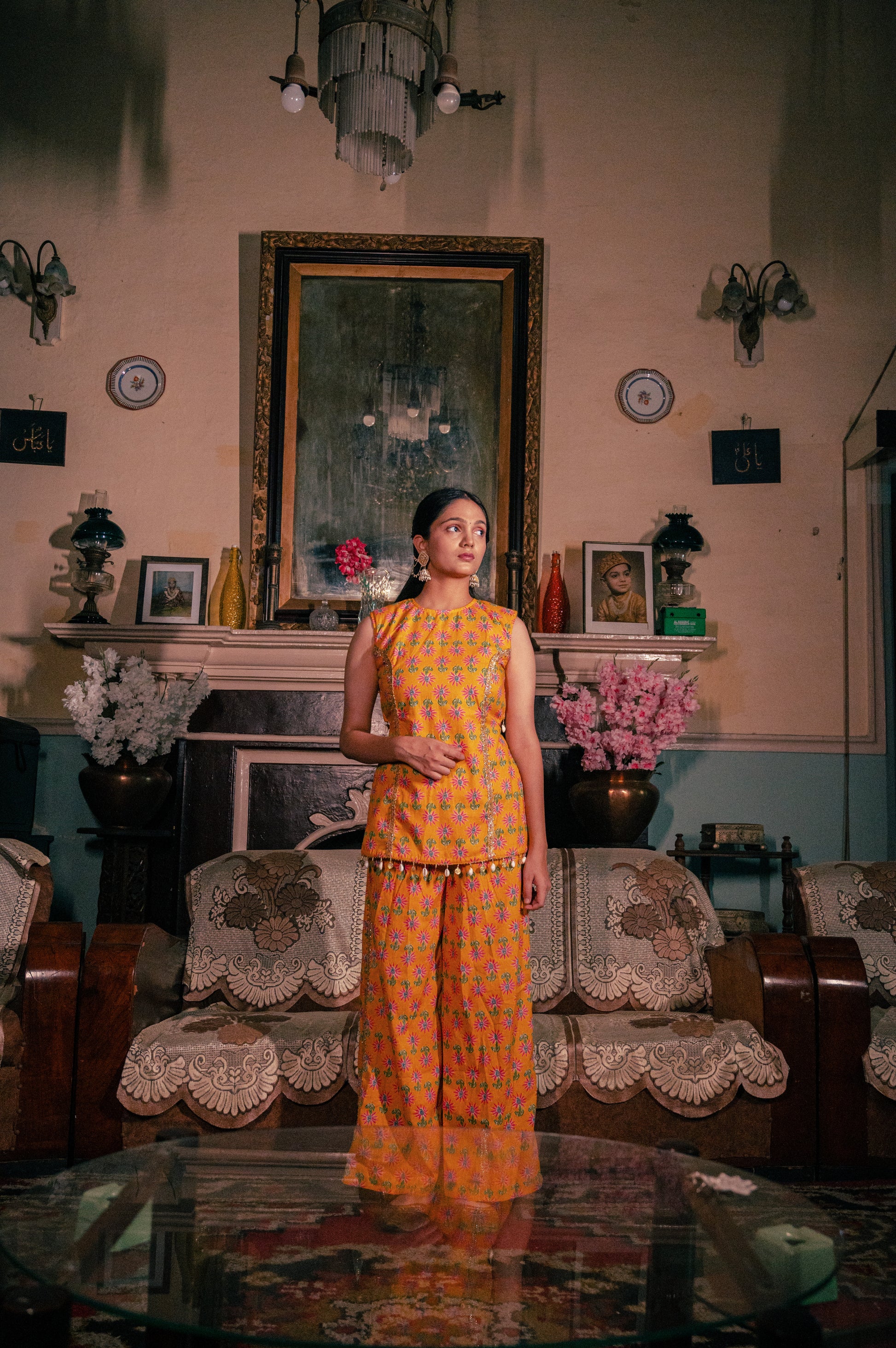 The Yelow printed Indo western Co-ord set consisting of top with tie up back and elevated padded shoulders paired with palazzo pants. The shell hanging on the top and zari details on the bottom makes it the go to for the festive occasion.