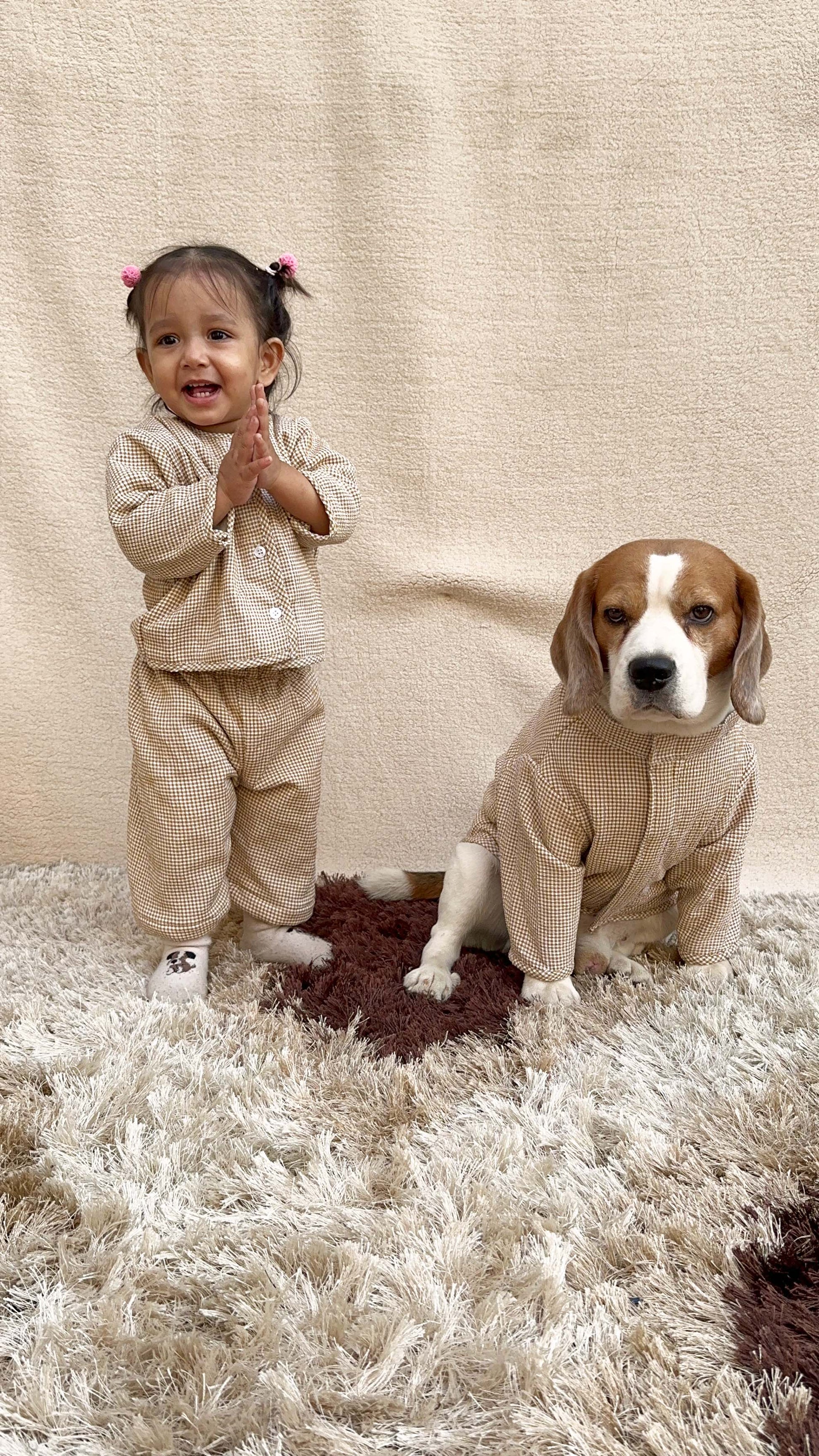 This combo includes a Yellow Checkerd Quilted Shirt for Dog and a yellow Checkerd quilted co-ord for baby.
